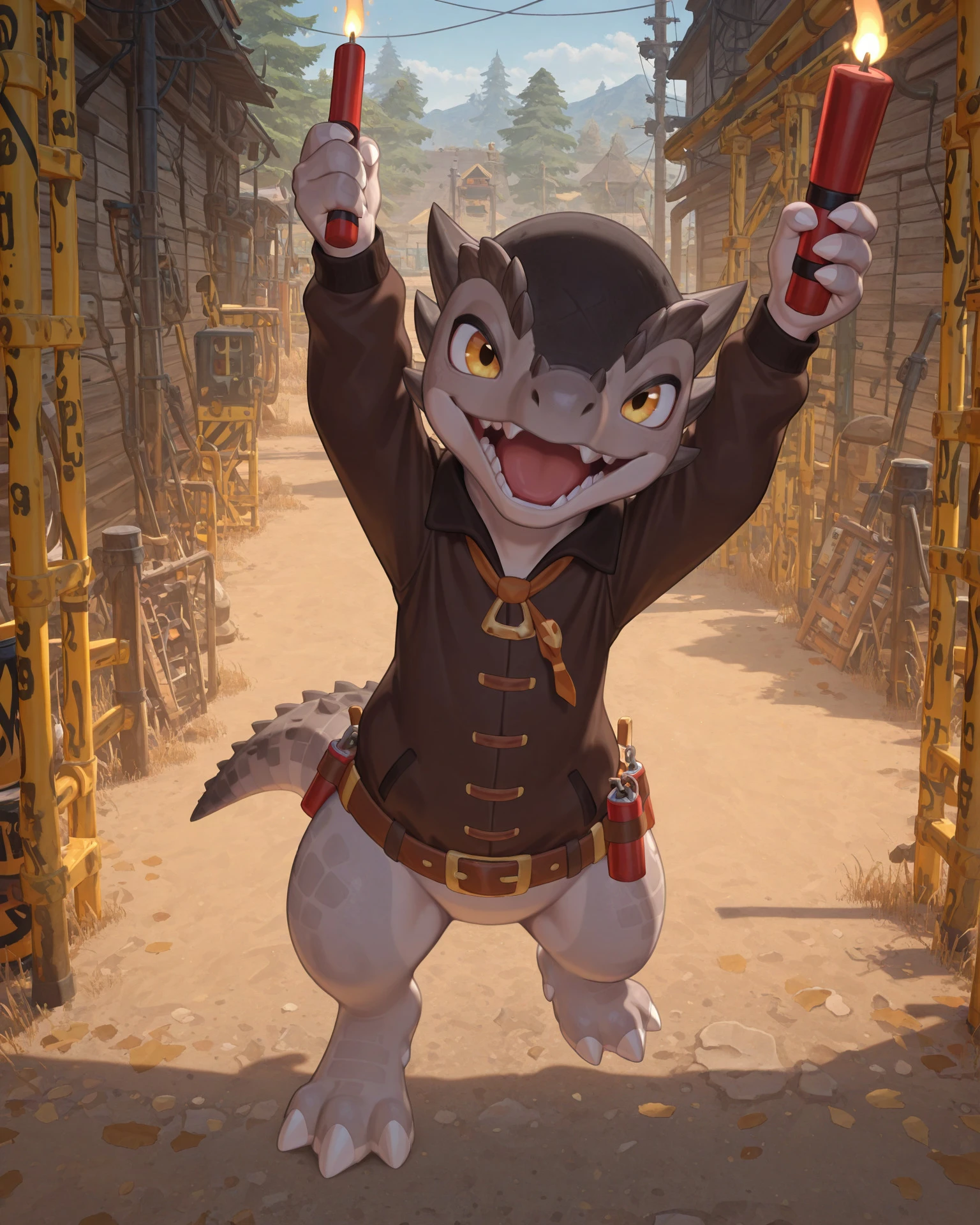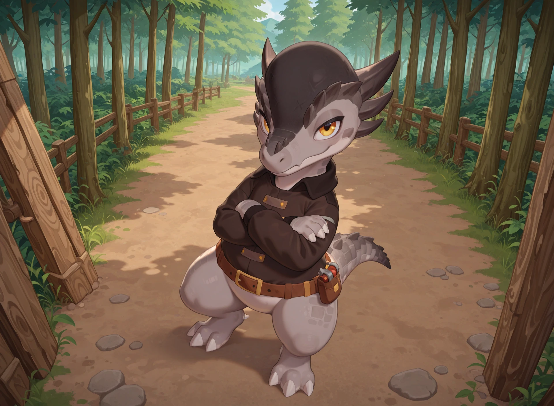 scout, male, Pachycephalosaurus, gray skin, yellow eyes, 5 fingers, 3 toes, brown jacket, spikes on the head, belt, tools on belt