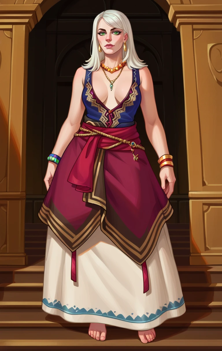 KeiraMetzSDXL,1girl,green eyes,jewelry,white hair,earrings,barefoot,necklace,bracelet