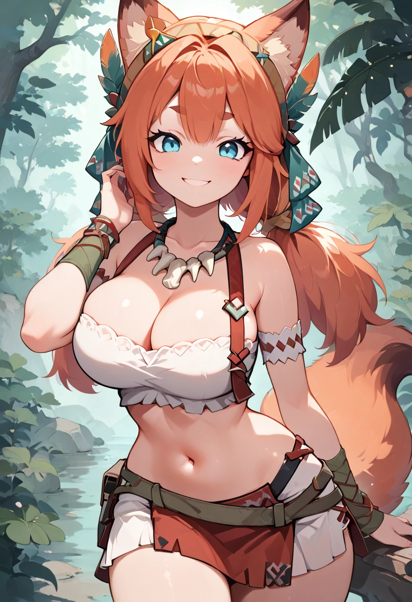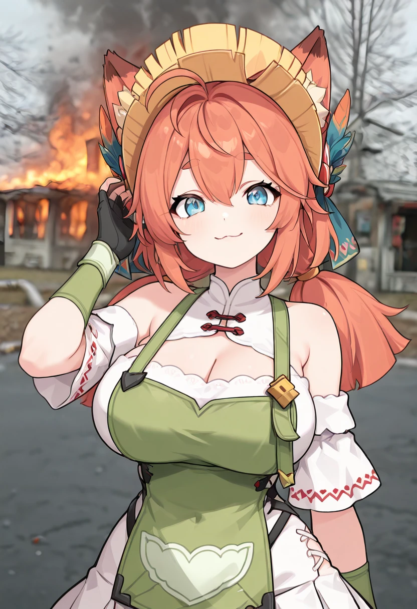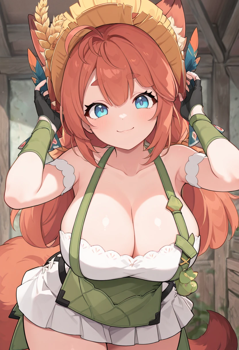 zzAnn, blue eyes, ahoge, orange hair, fox ears, animal ear fluff, low twintails, short twintails, gloves, green apron, pleated skirt, fingerless gloves, white skirt, straw hat,
