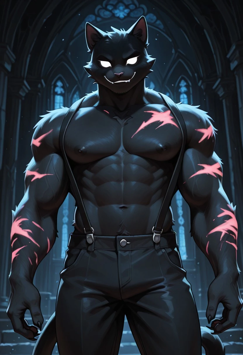 cat, purple scars, glowing scars, glowing eyes, black fur, white eyes
