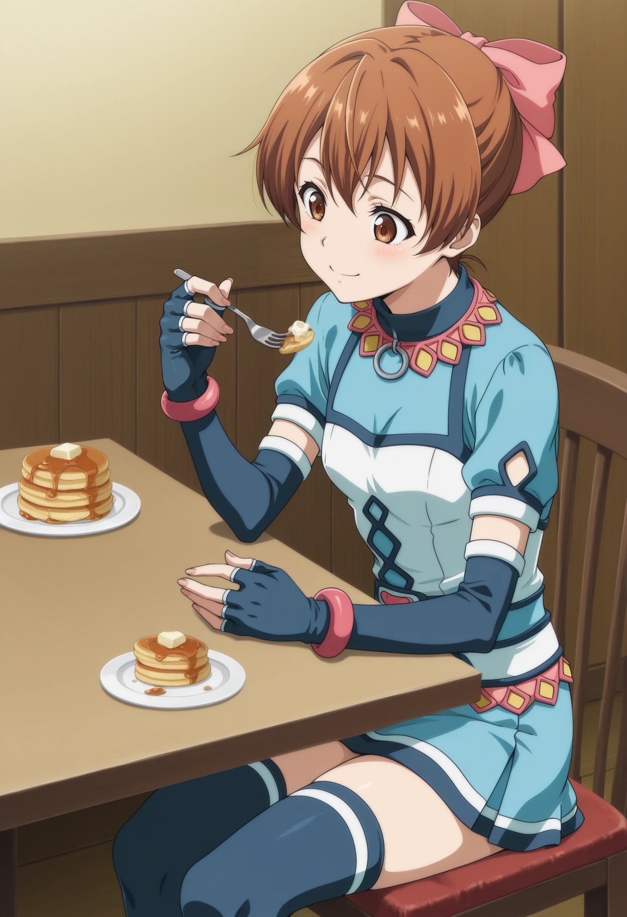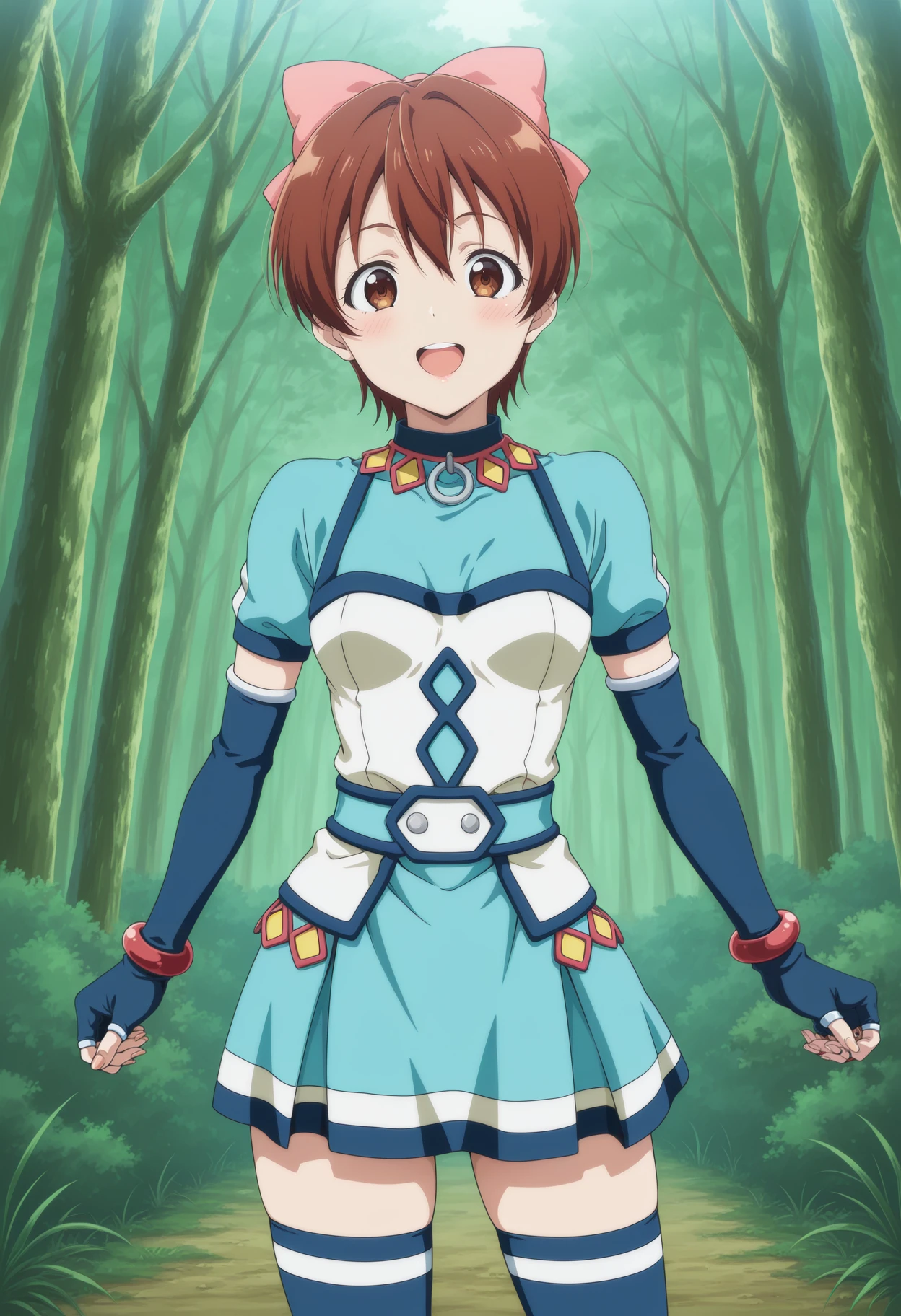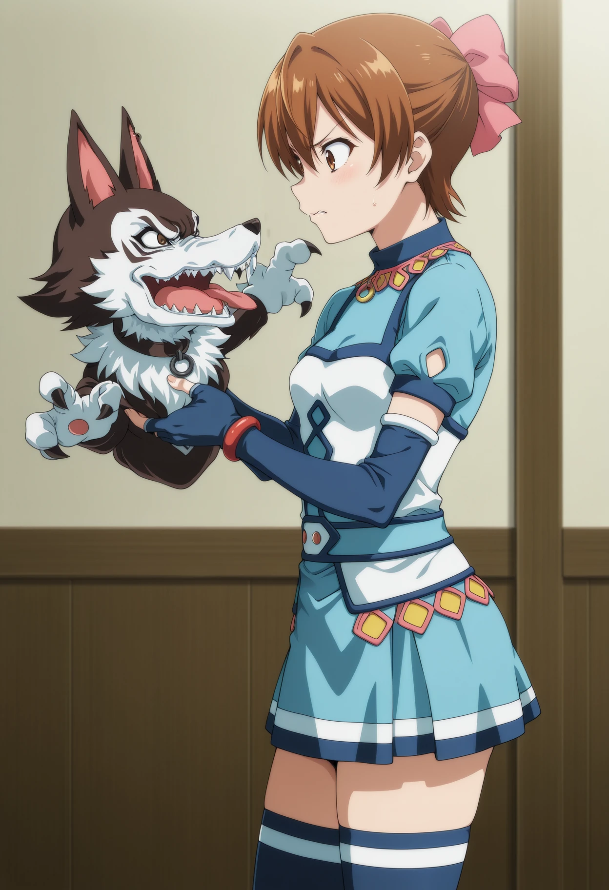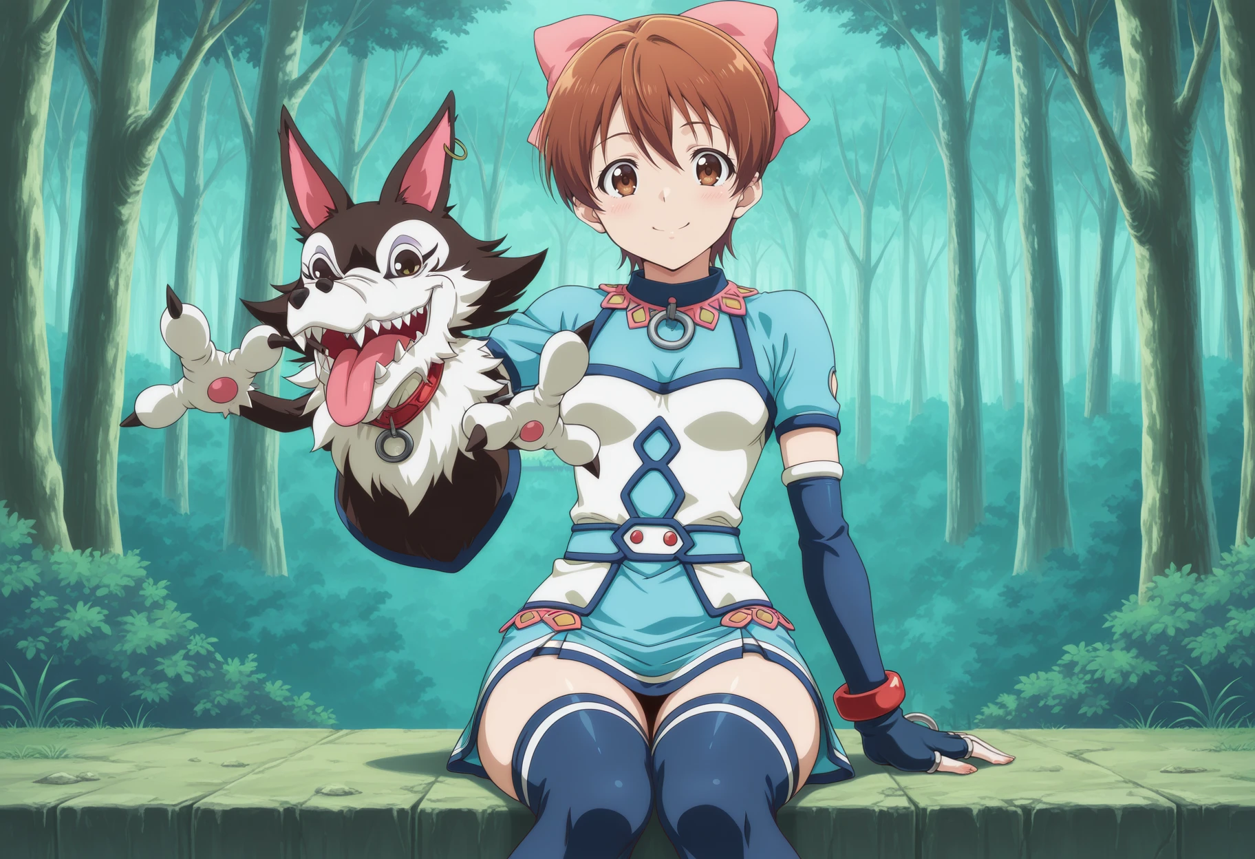 Mel from Suikoden III Notable tags: short hair, brown hair, ribbon, brown eyes, sleeveless, short dress, o-ring, fingerless gloves, thighhighs, hand puppet