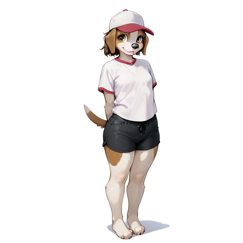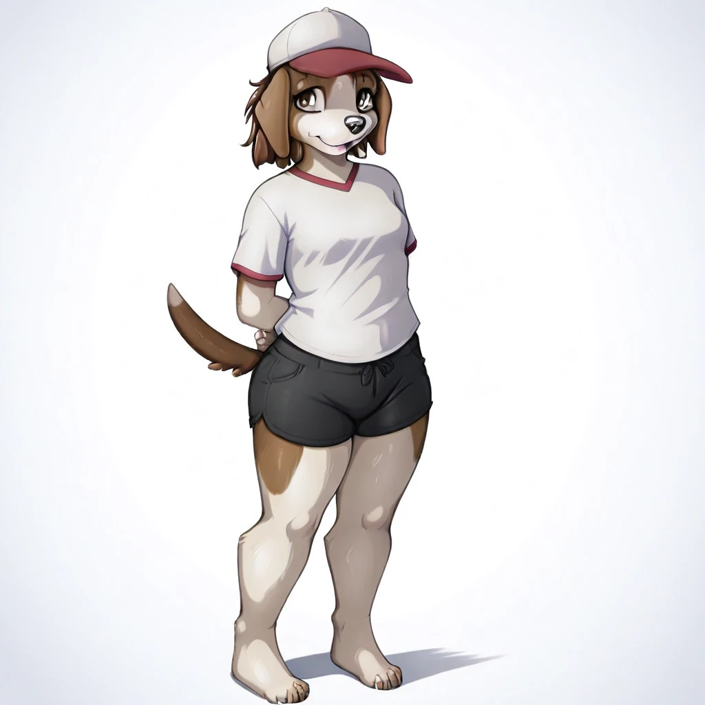 dog, dog girl, beagle, brown and white fur, brown hair, short hair, brown eyes, black nose, dog ears, dog tail, Plump, small breasts,