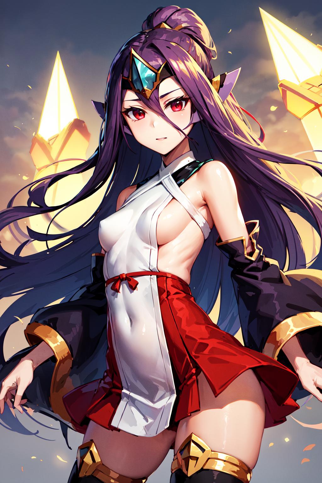 izanami1, 1girl, solo, sideboob, detached sleeves, very long hair, black thighhighs, half updo