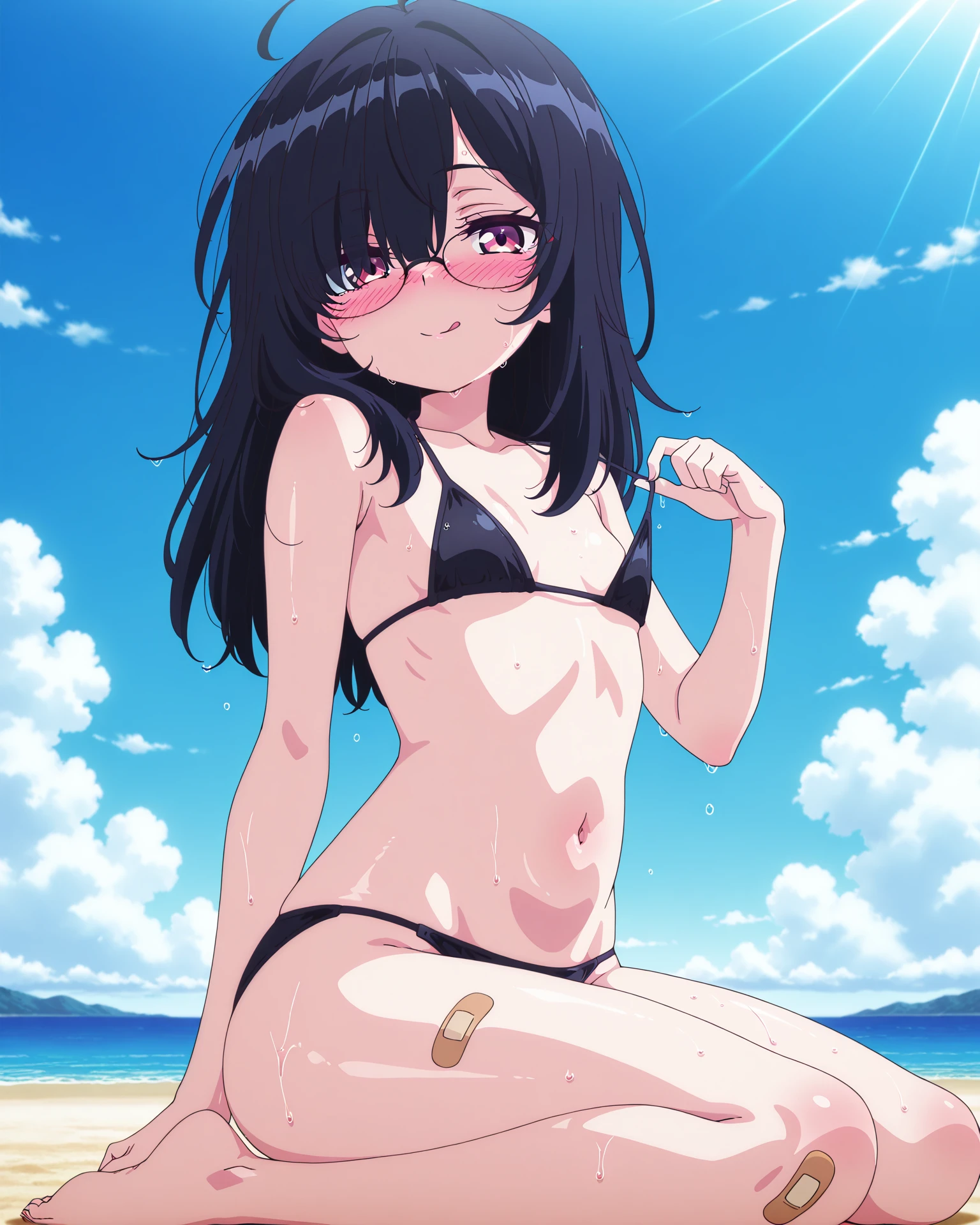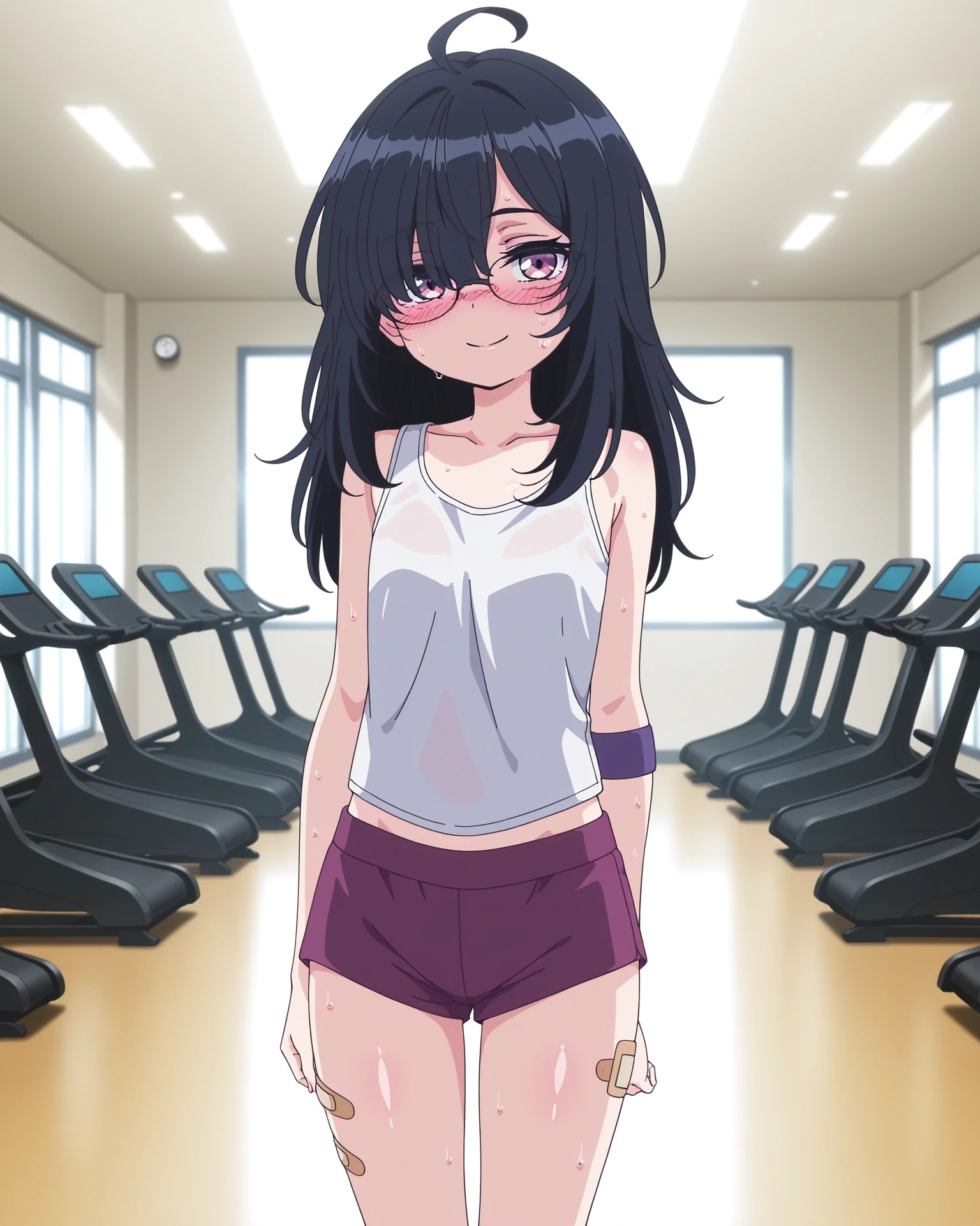 white tank top,glasses, bandaid on leg