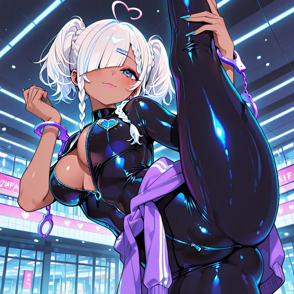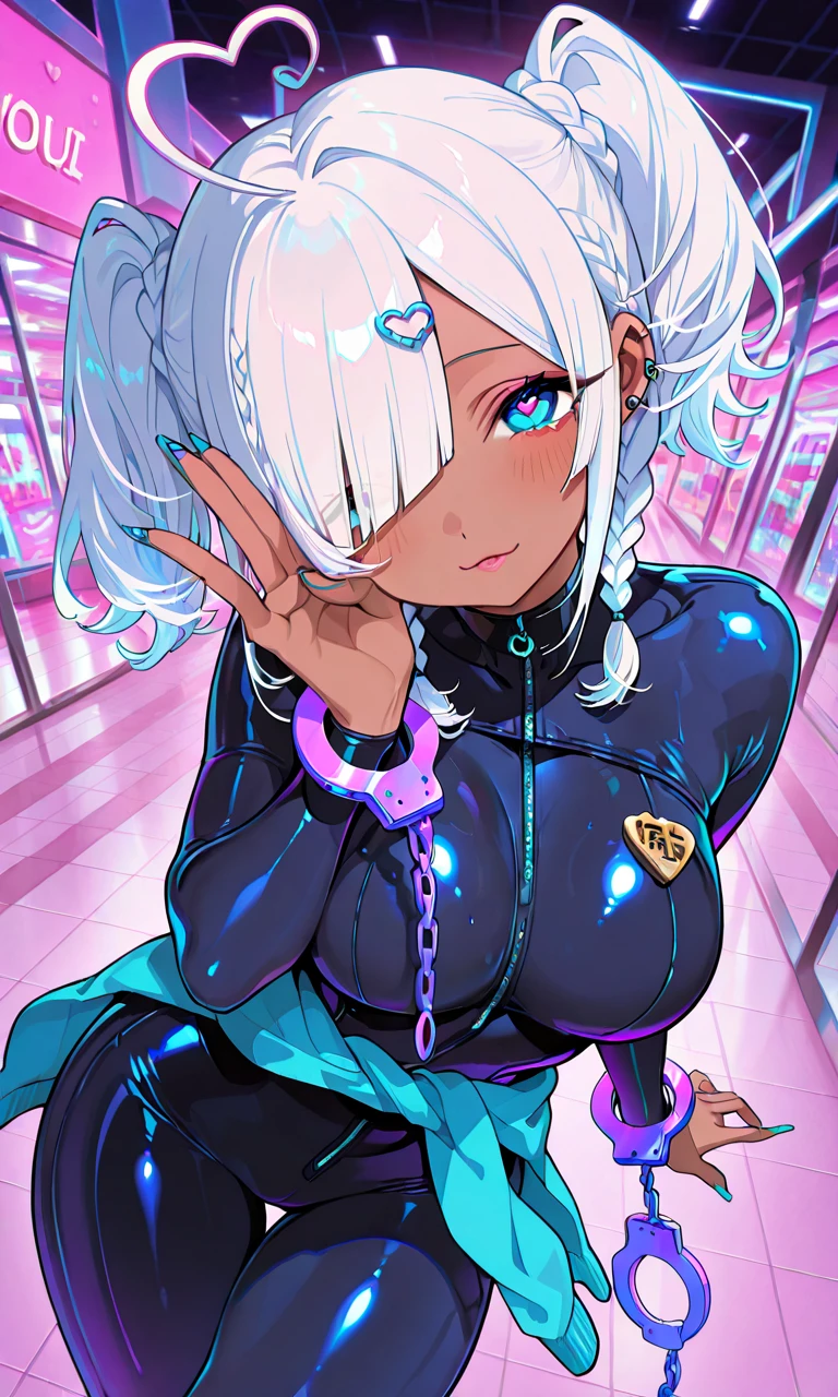 1girl, dark skin, gyaru, white hair, short twintails, african braids, diagonal bangs, bangs over one eye, heart-shaped ahoge, blue eyes, 🧥Outfit