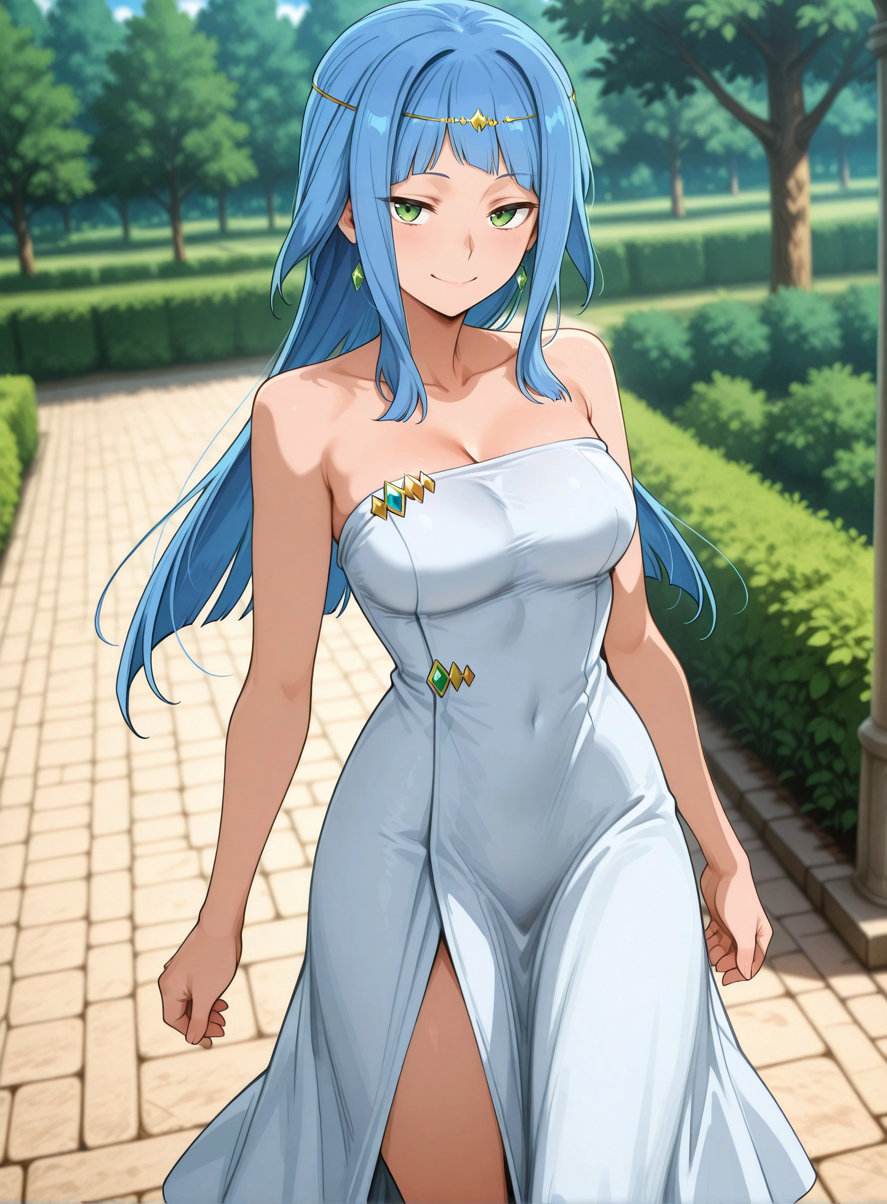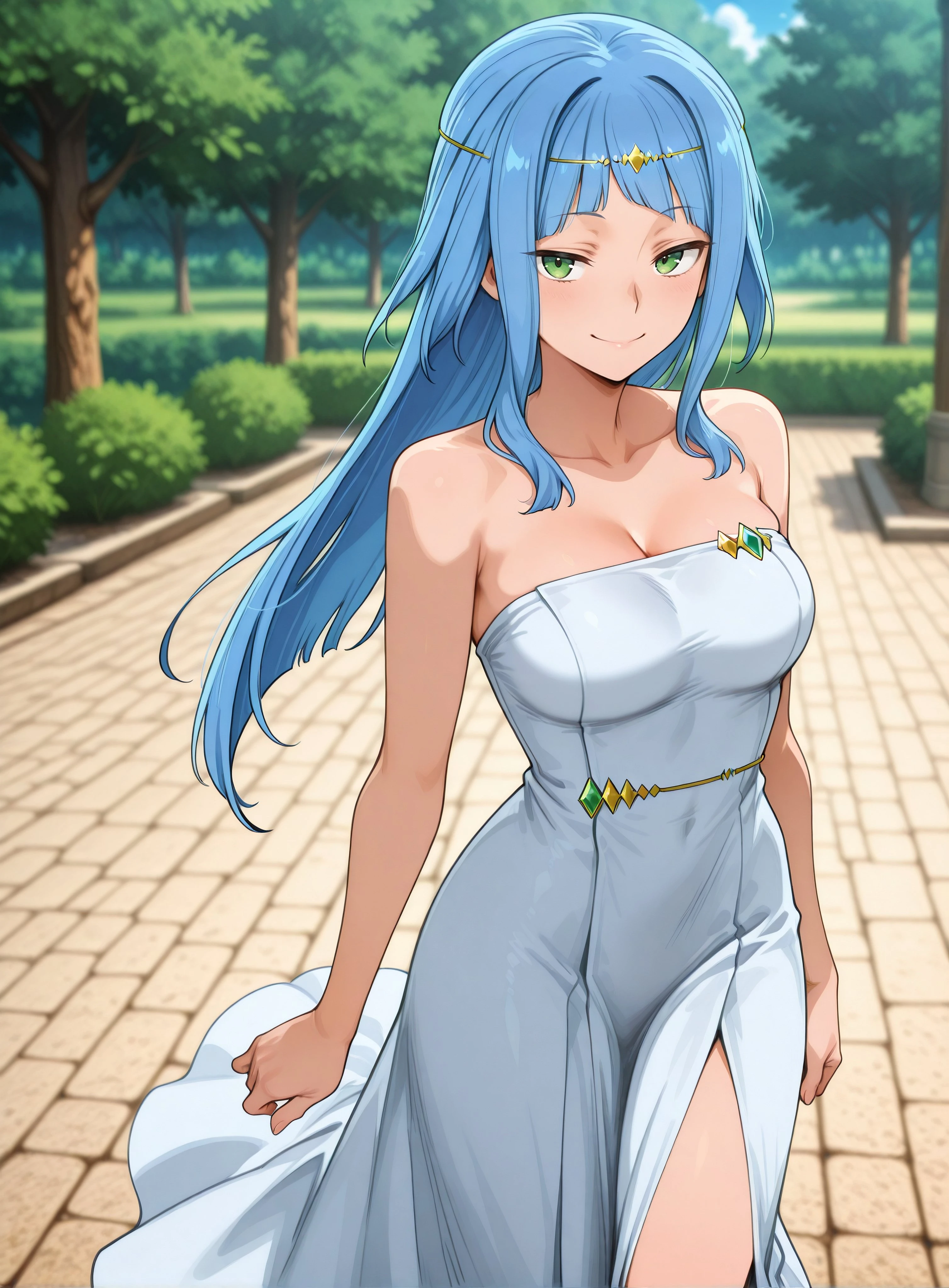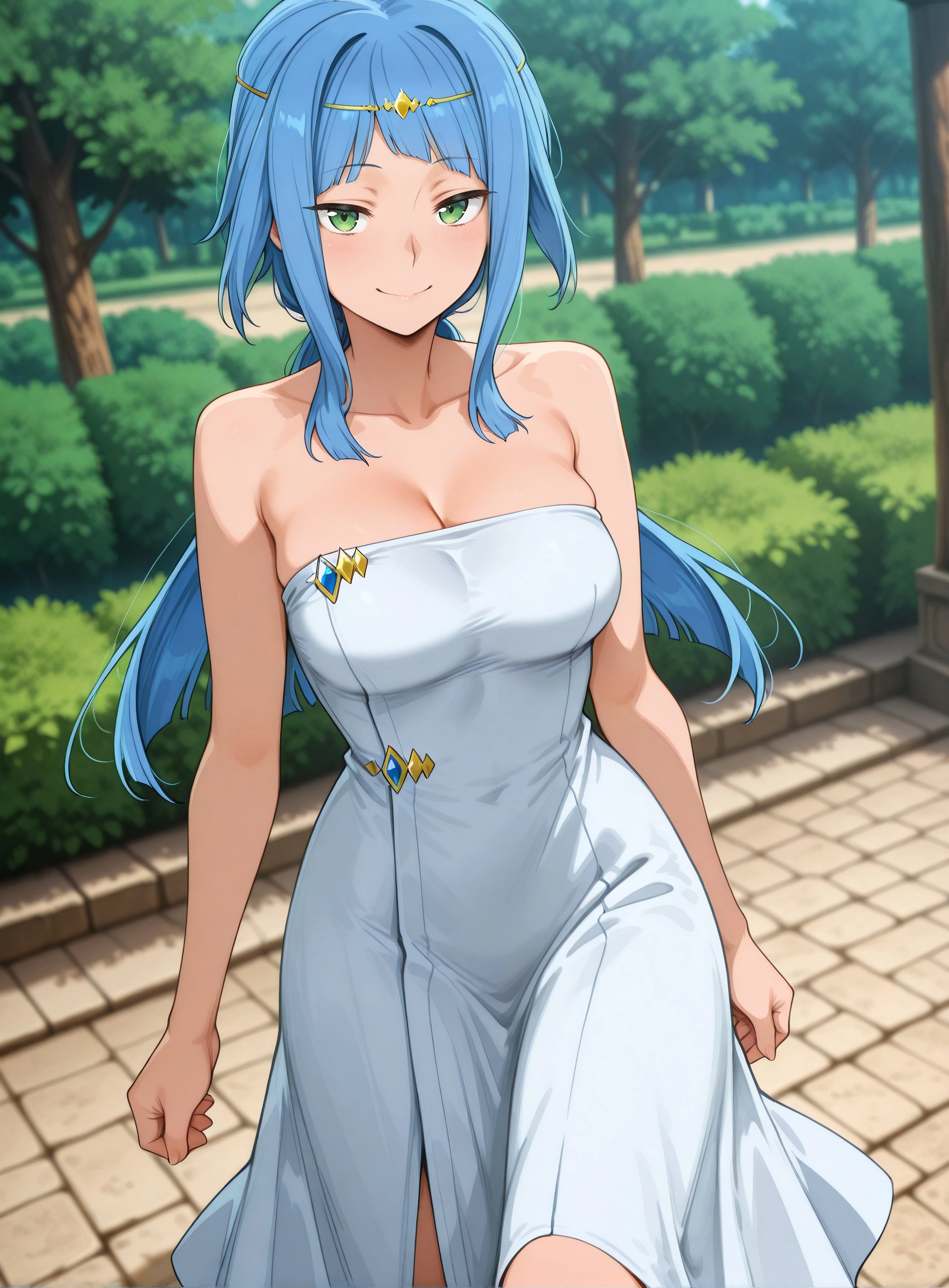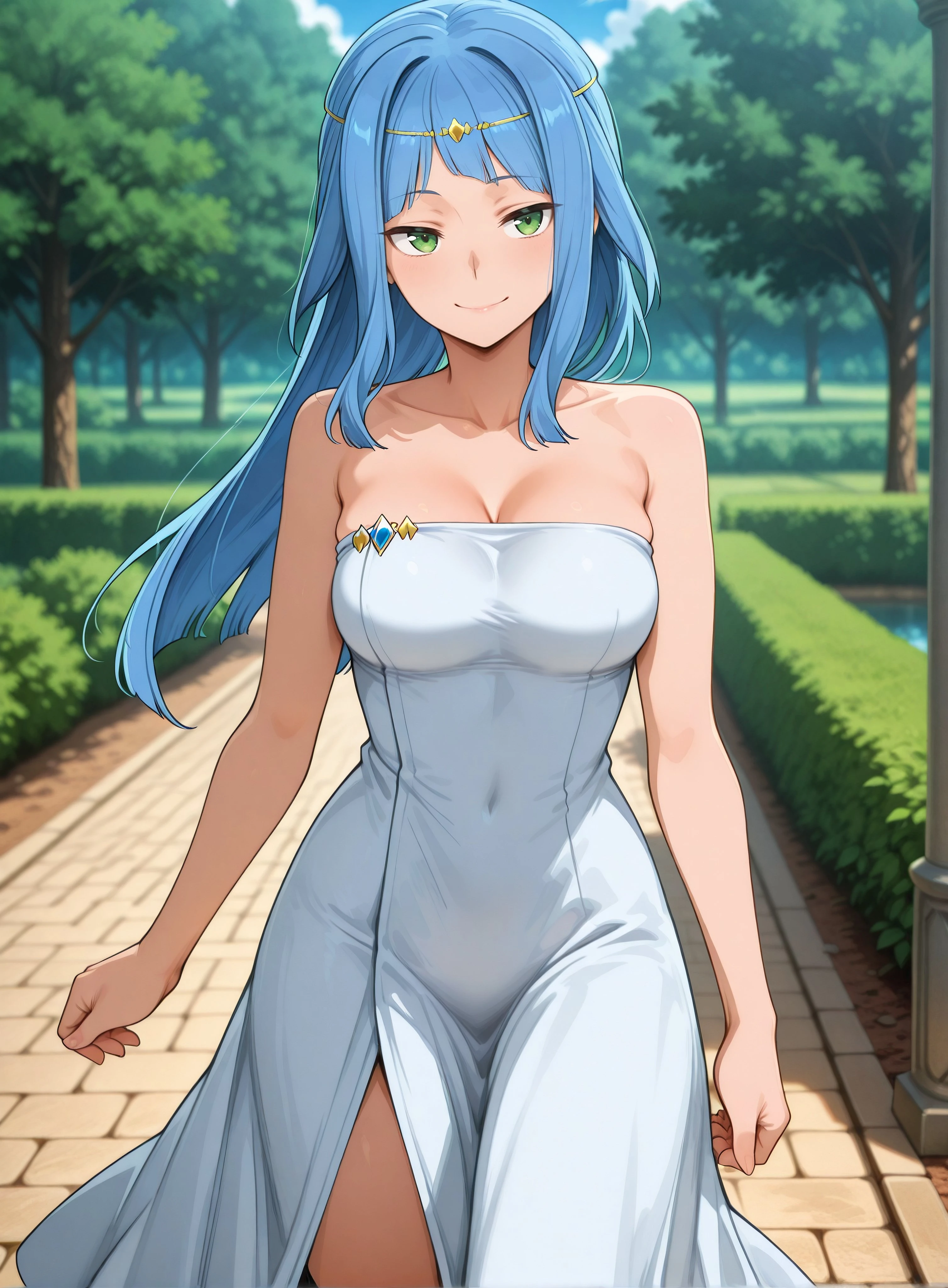 circlet, jewelry, shoulders, white dress, strapless dress, circlet, legs, long dress
