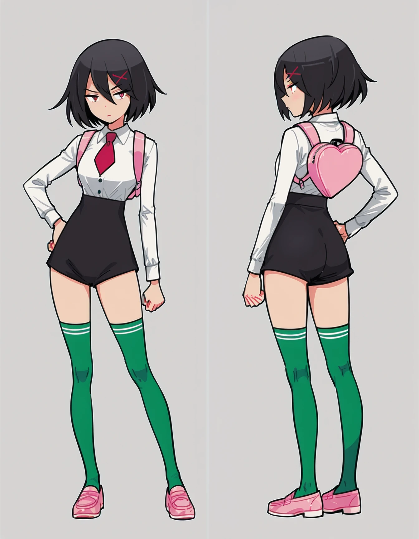 necktie, high-waist shorts, pink backpack,black shorts,shirt, shirt tucked in,red necktie,white shirt,short necktie, collared shirt,long sleeves,wing collar,