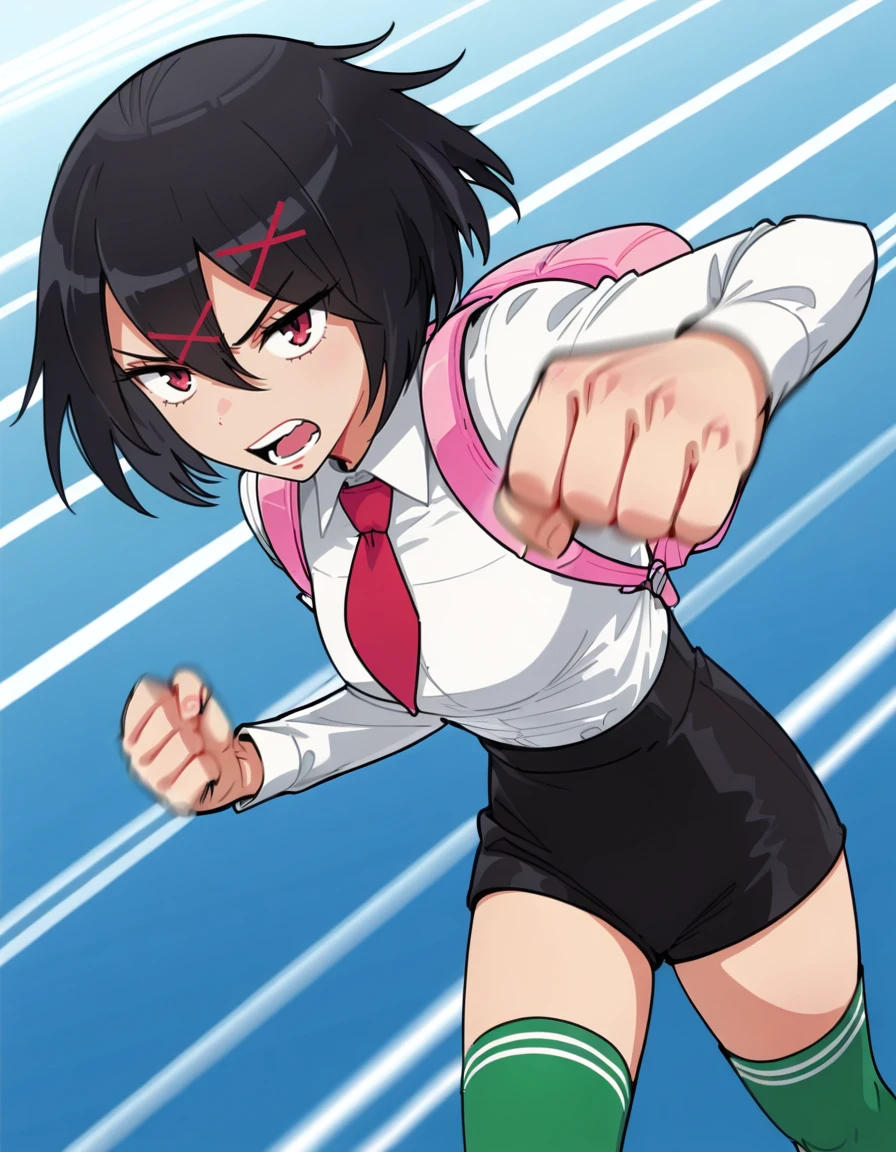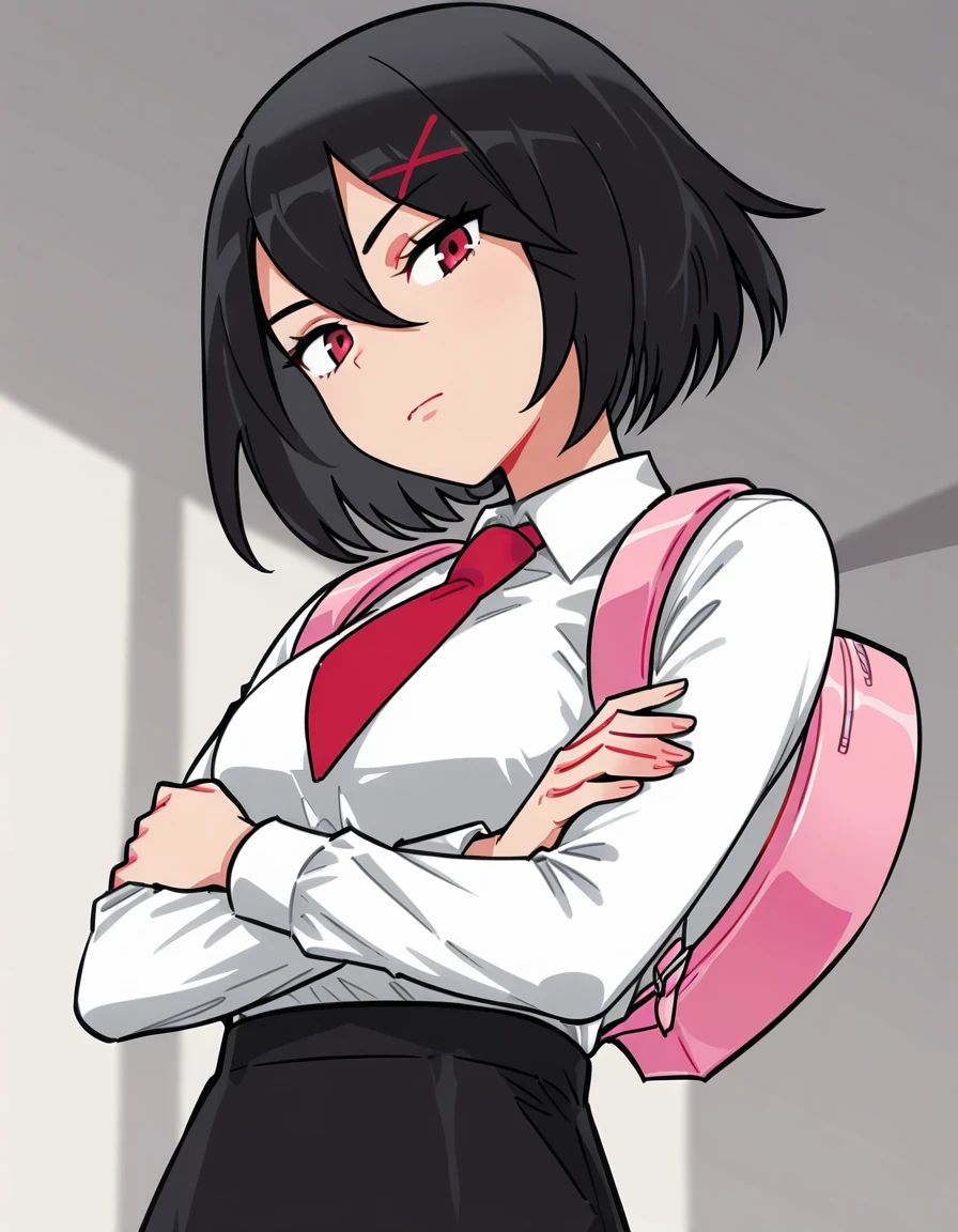 black hair, x hair ornament,hair between eyes, red eyes,short hair,