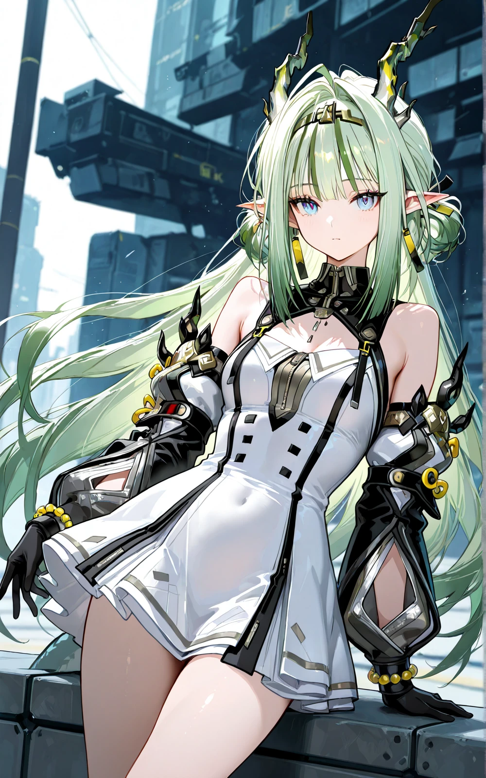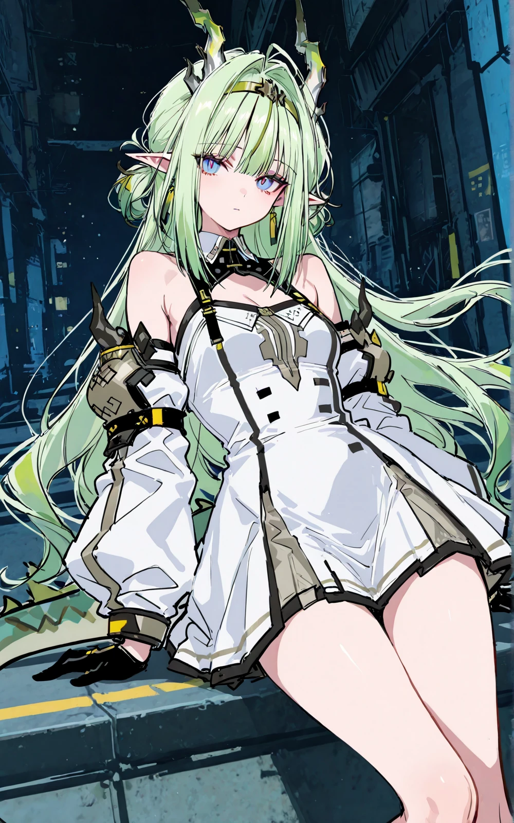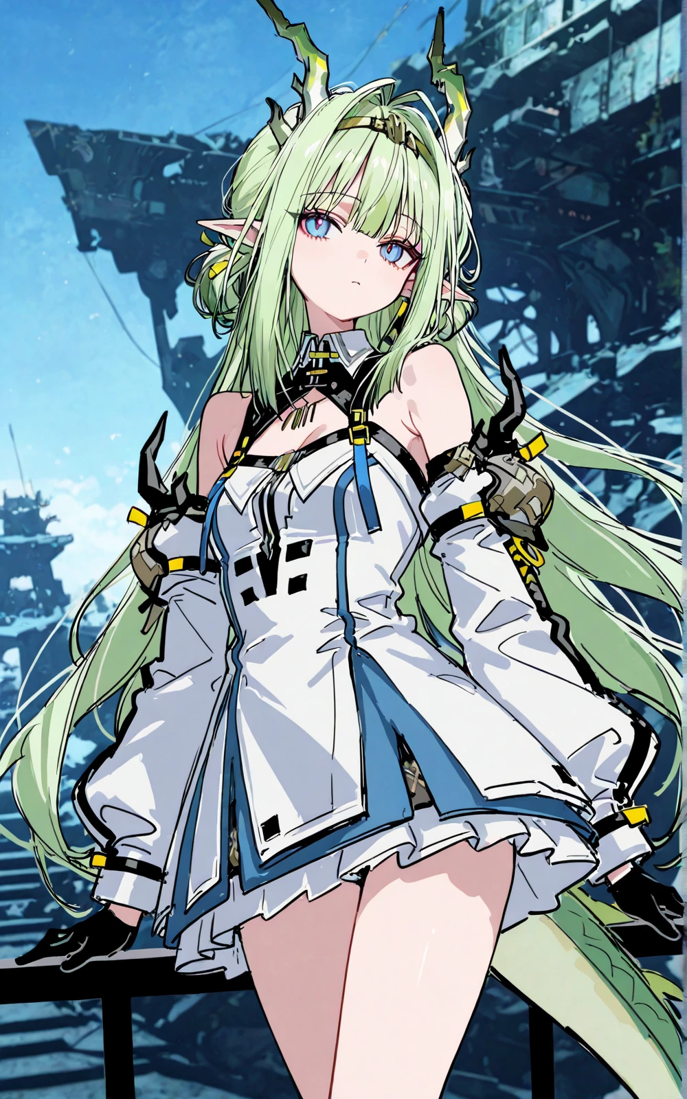 long green hair, pointed ears, horns, blue eyes, white and blue dress, futuristic armor, black gloves, dragon girl, colored skin, dragon horns, pointy ears, dragon tail, hair between eyes, bare shoulders, off shoulder, shui13 \(arknights\)