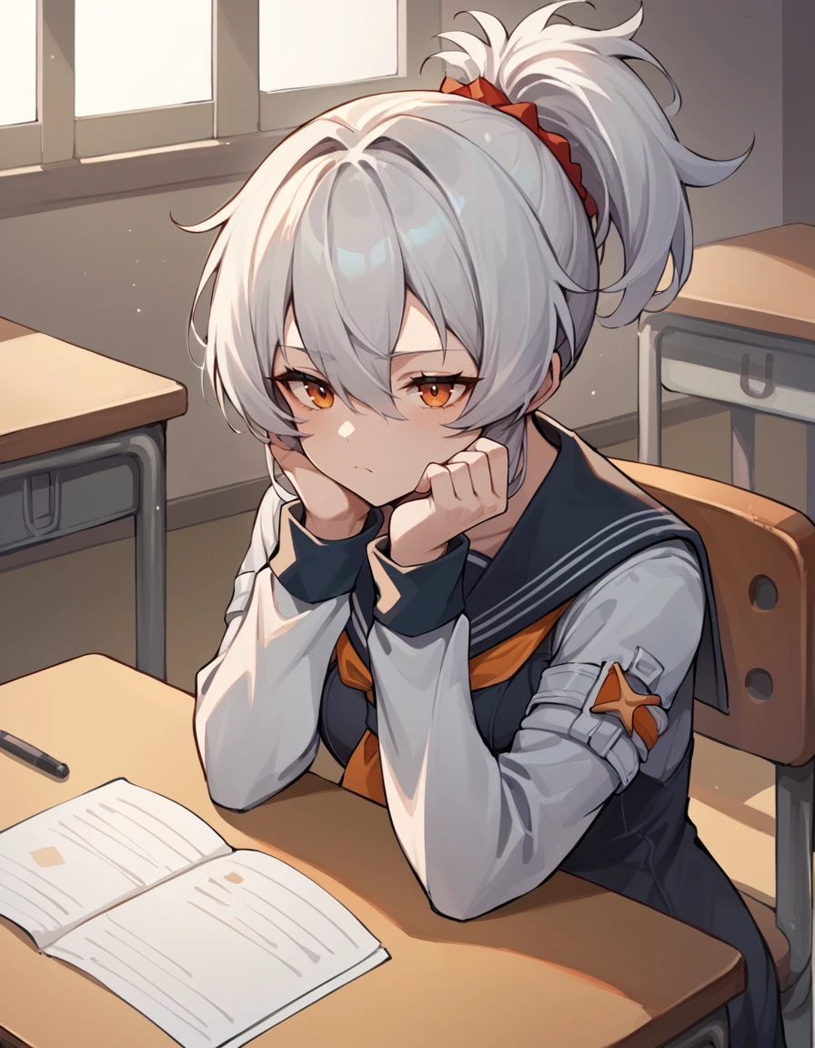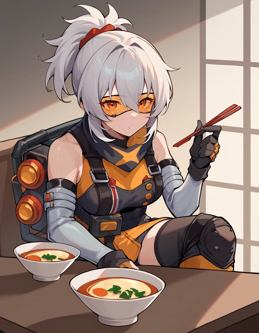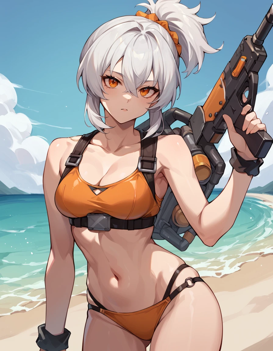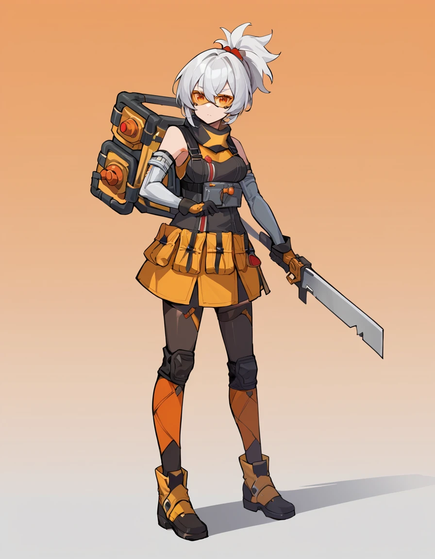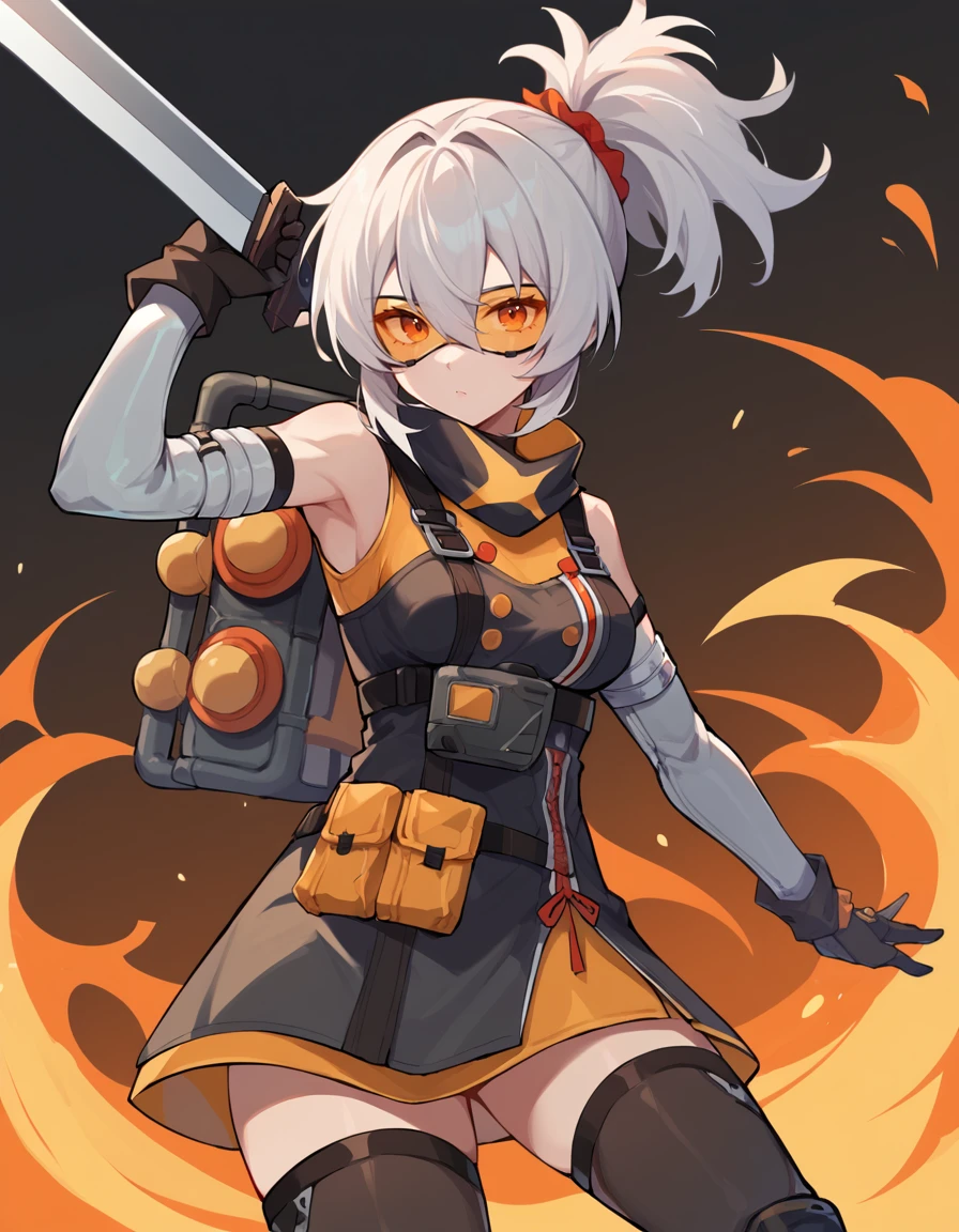 soldier 11, white hair, hair between eyes, hair scrunchie, ponytail, orange eyes, medium breasts, goggles, orange tinted eyewearClothes