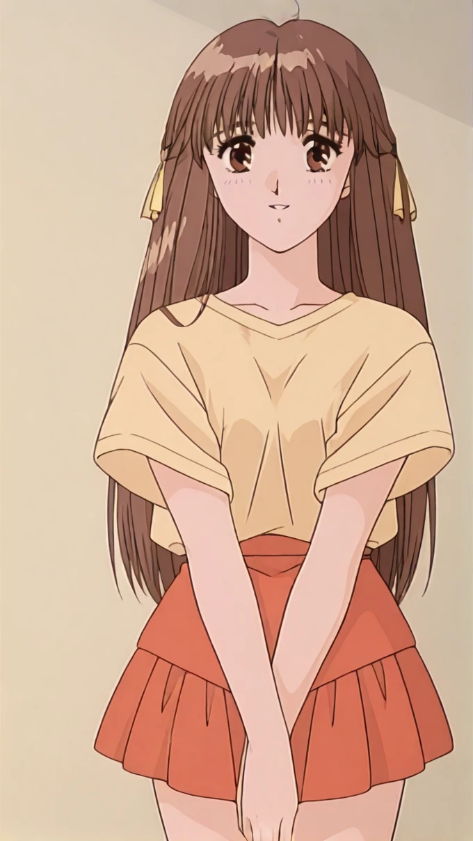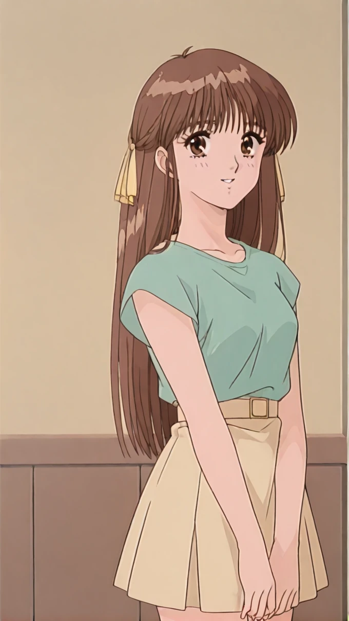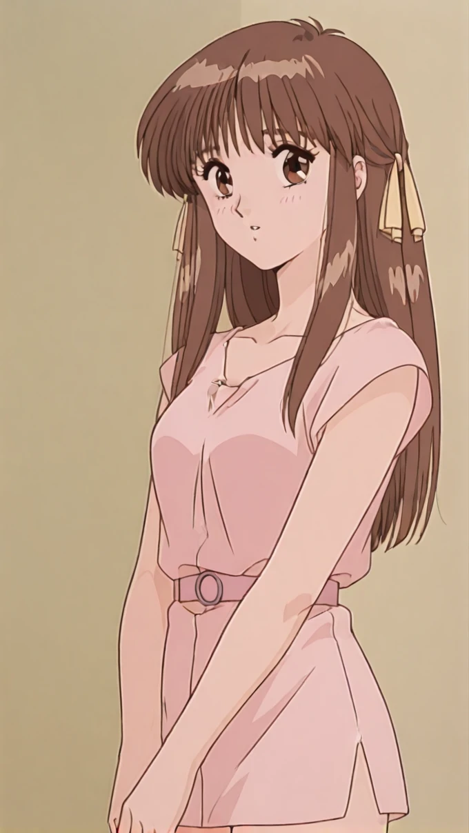 anime screencap,anime coloring<lora:sakuragi_mai - doukyuusei:0.8>1girl, solo, long hair, looking at viewer, bangs, brown hair, brown eyes, hair ribbon, parted lips, , sakuragi_mai, retro artstyle