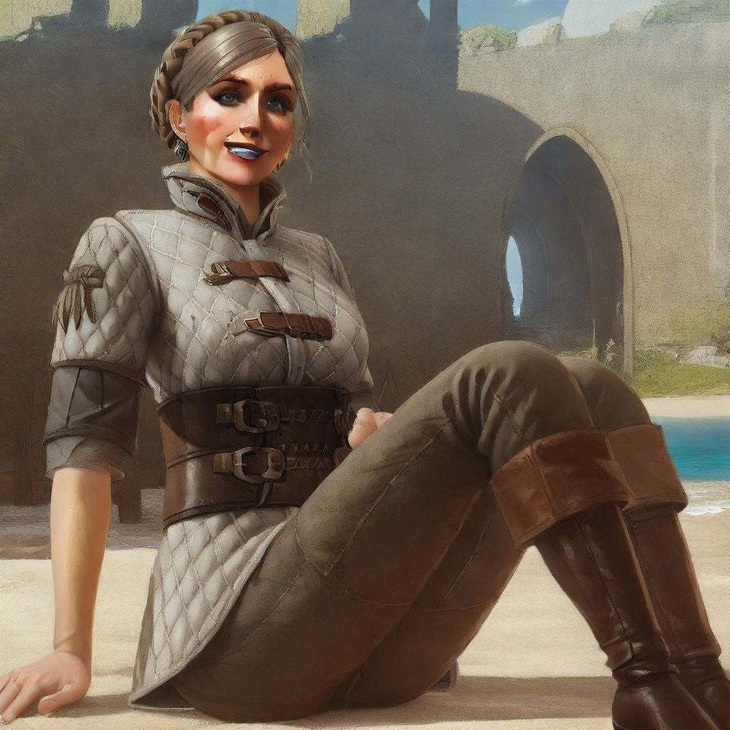 rosa von attre \(the witcher\), brown hair, short hair, braid, blue eyes, lipstick, earrings, jewelry, military uniform, corset, pants, heels, large breasts, 1girl, solo