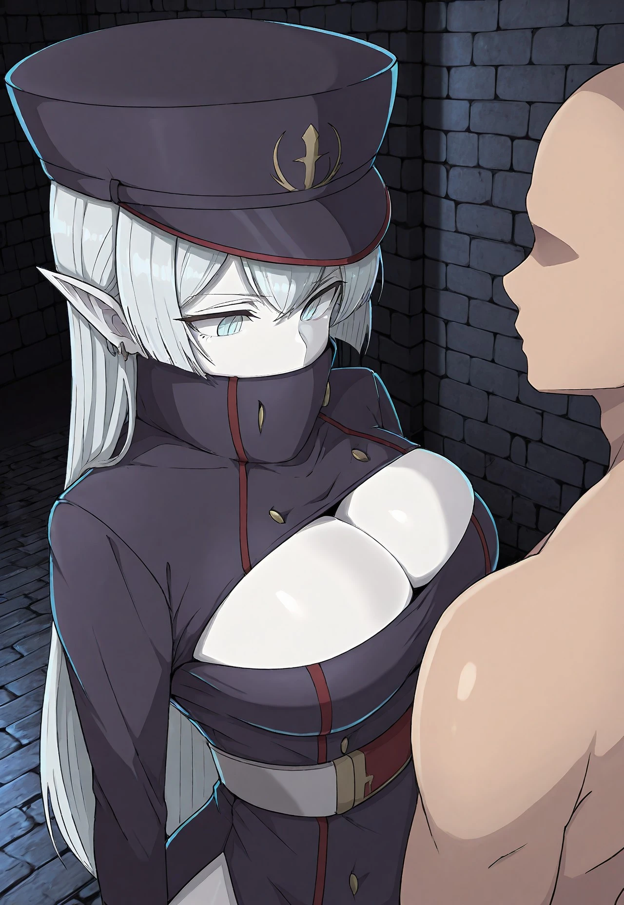 military uniform, peaked cap, high collar, belt, thigh high boots, cleavage cutout,