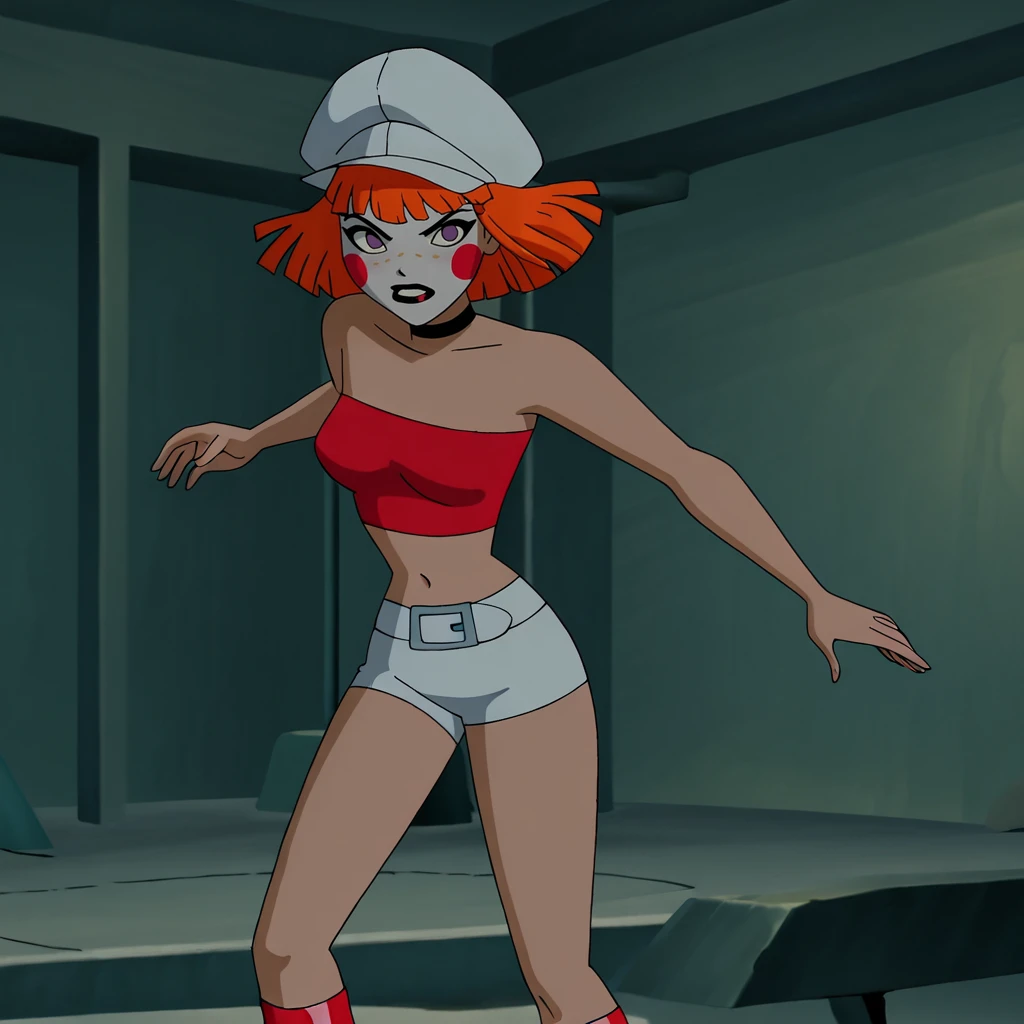 Trigger : DeeDee, 1girl, knee boots, short shorts, hat, midriff, orange hair, choker, navel, short hair, belt, blush stickers, white shorts, makeup, purple eyes, red footwear, ???? shoulders, strapless, tube top, ???????, cowboy shot