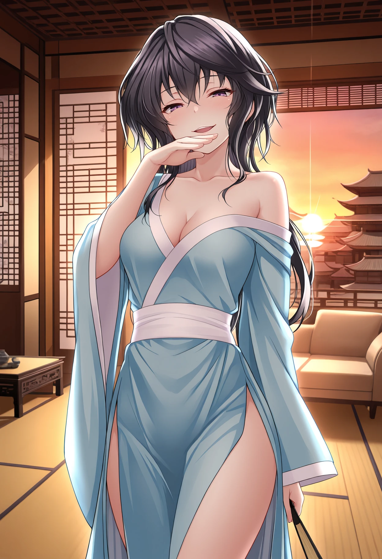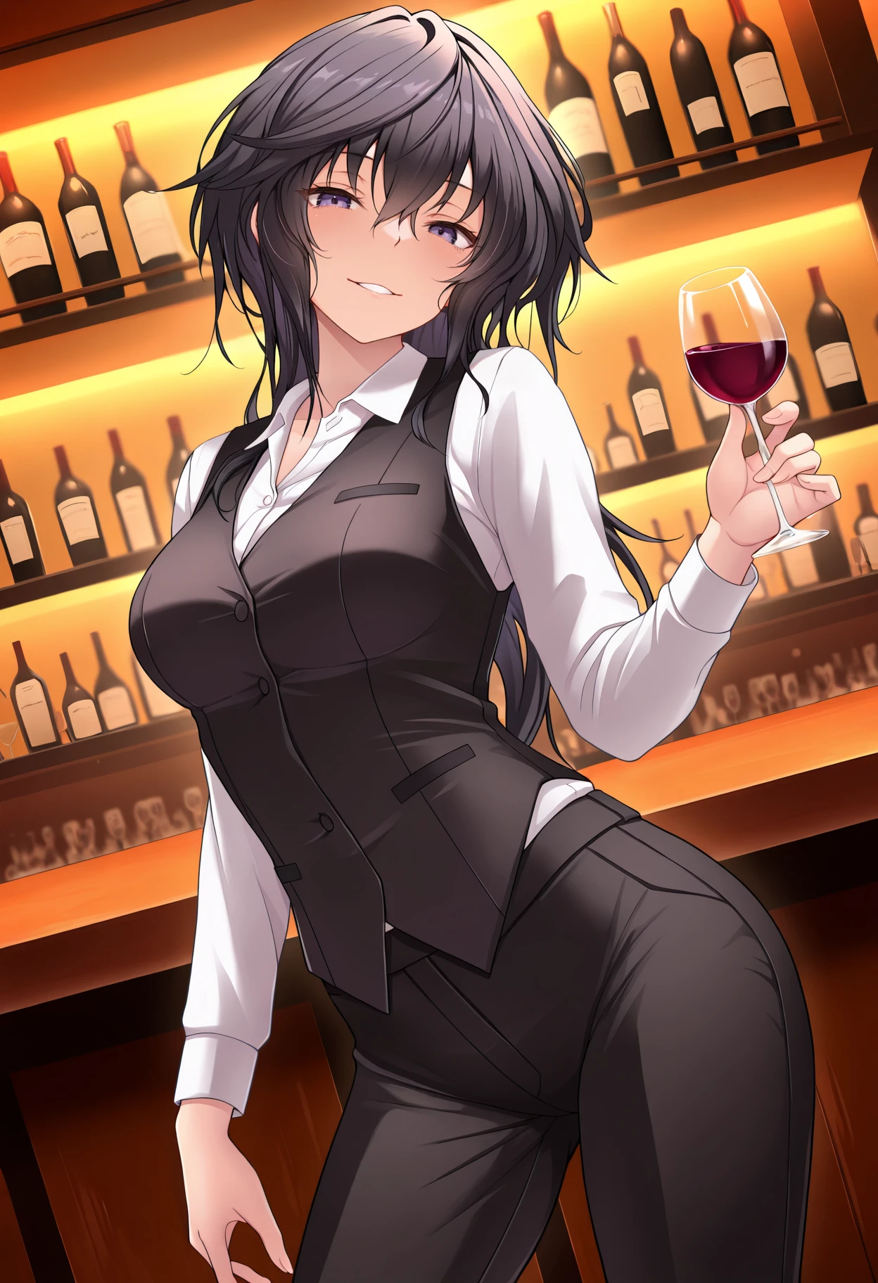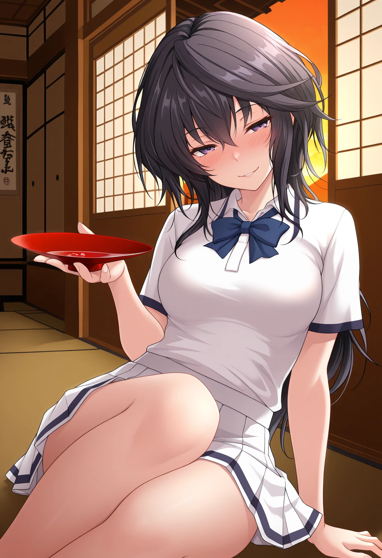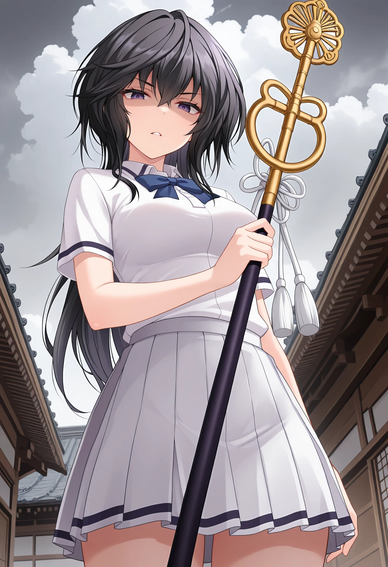 KJObenkei, black hair, dark purple eyes, long hair, hair between eyes,