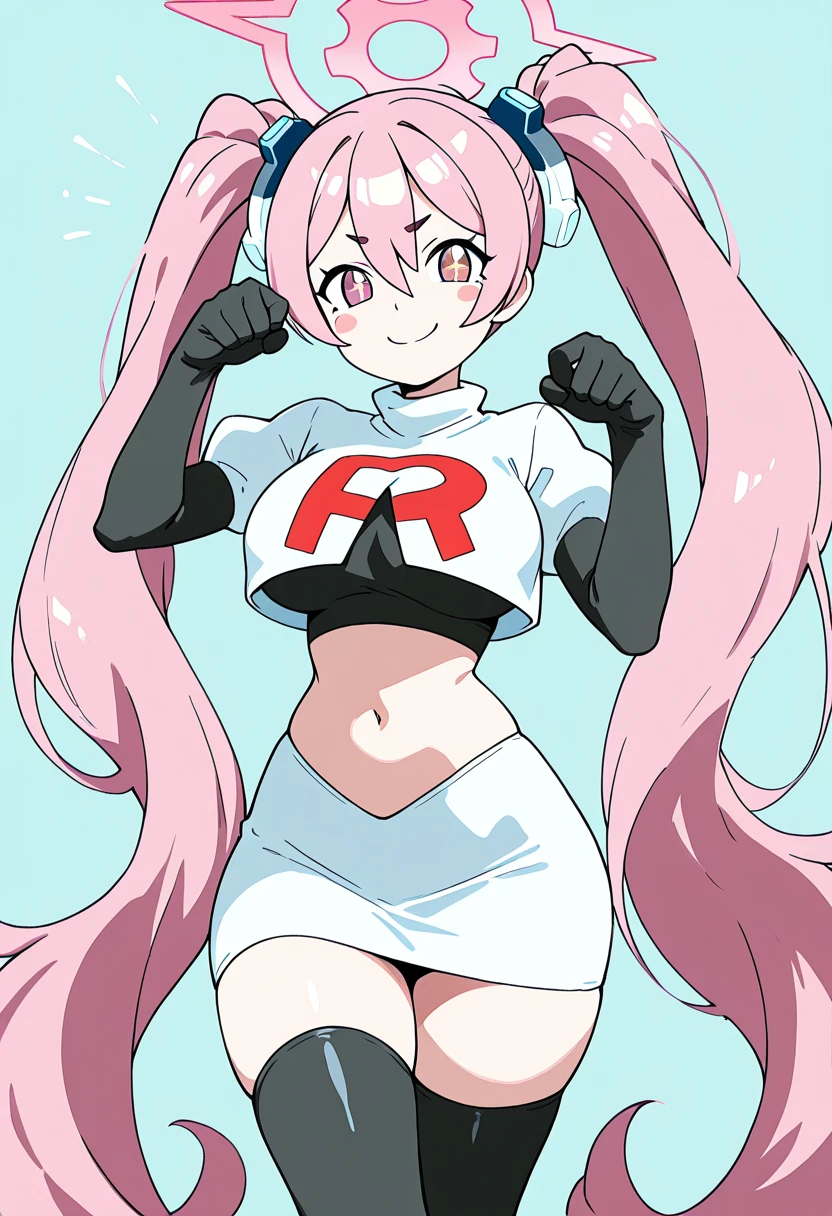 zzKoyuki, pink eyes, hair between eyes, long hair, pink hair, pink halo, twintails, hair ornament, aged up, large breasts, black skirt, blue necktie, collared shirt, long sleeves, pleated skirt, white jacket, white shirt, white thighhighs, black gloves, blush stickers, id card, open jacket,