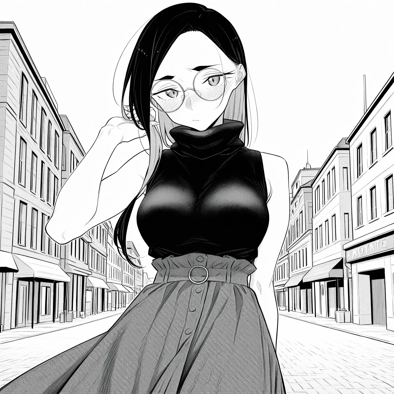 outfit2; toyodate, glassess, skirt, long skirt, turtleneck, sleeveless