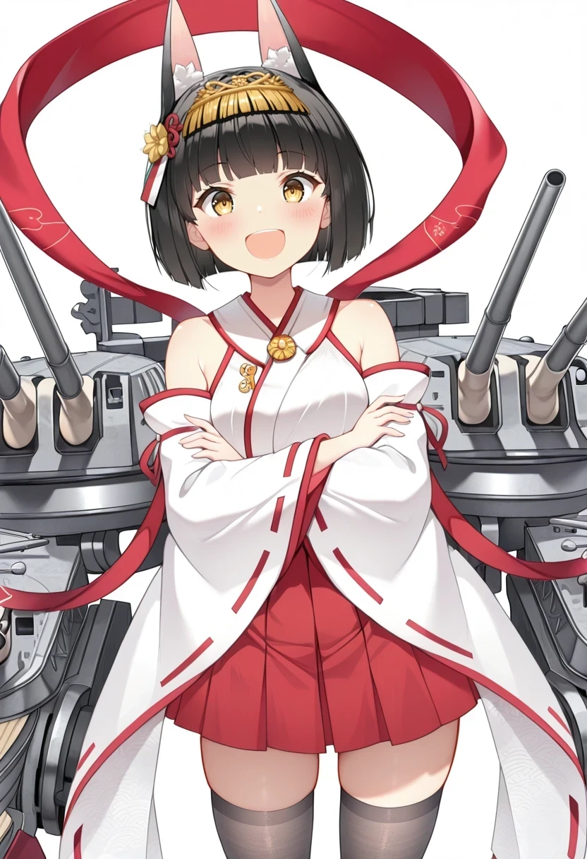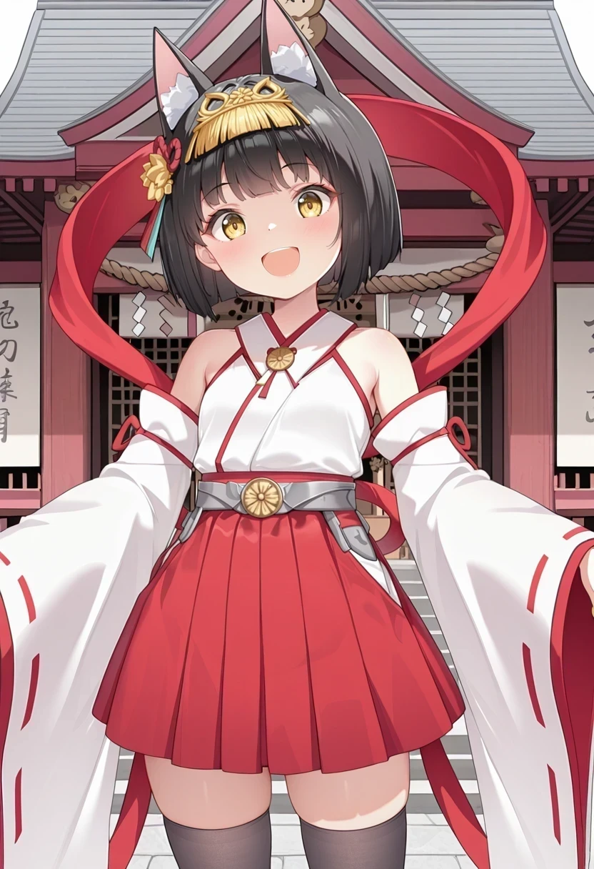 hair ornament,hakama,red skirt,detached sleeves,bare shoulders,black thighhighs,straight hair,red hagoromo,yellow ornament,ribbon-trimmed sleeves,Samurai: