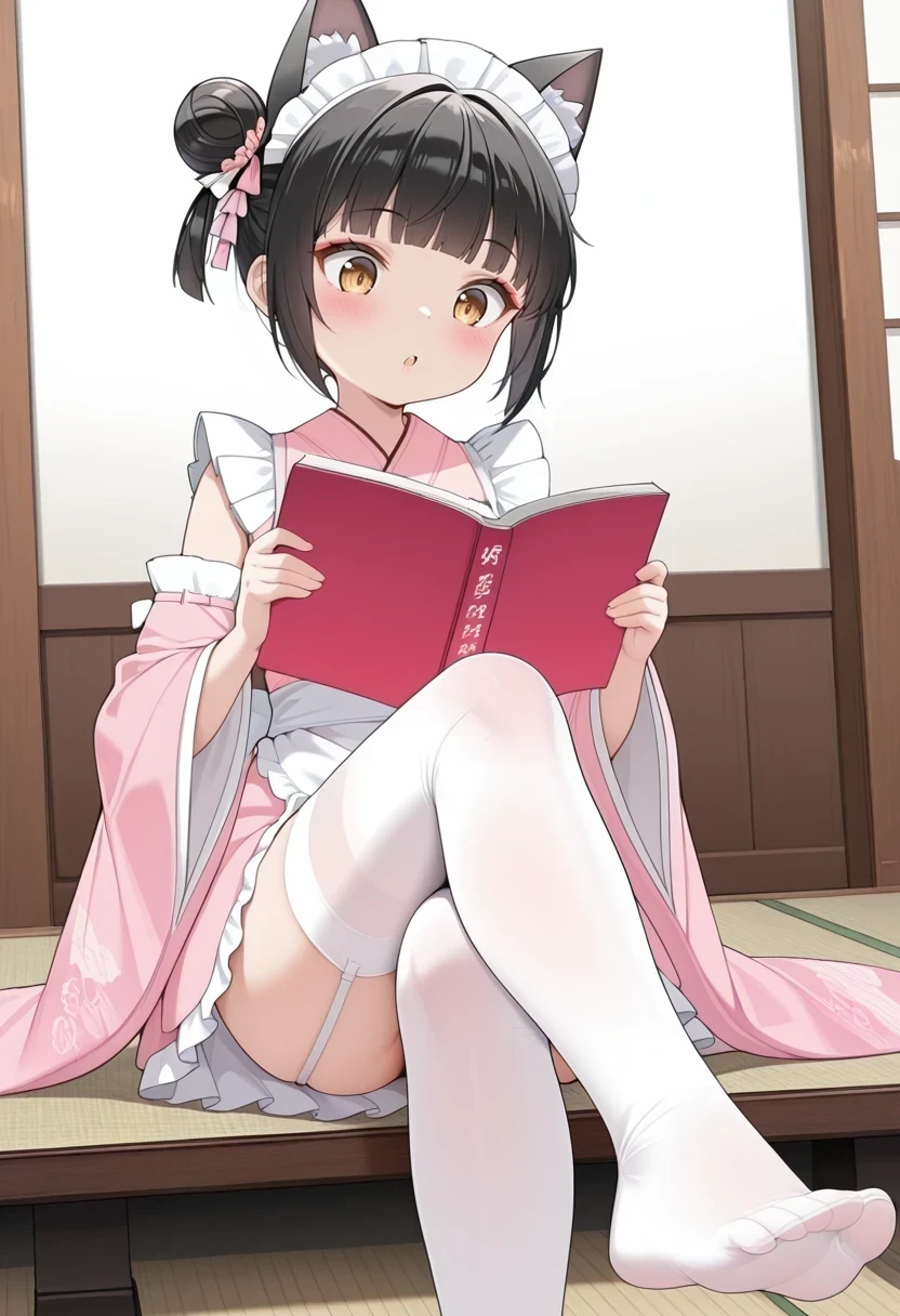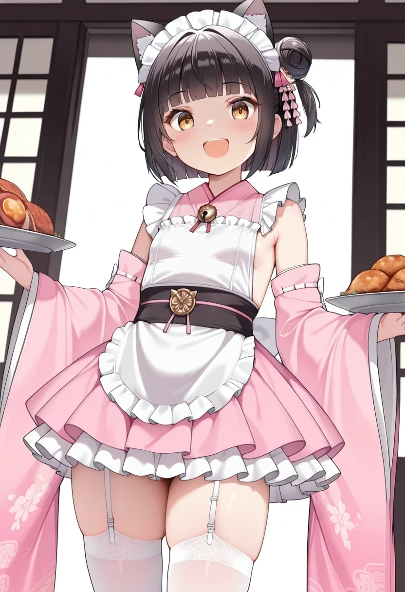 maid headdress,white apron,pink kimono,frilled skirt,white thighhighs,garter straps,single hair bun,one side up,detached sleeves,Description