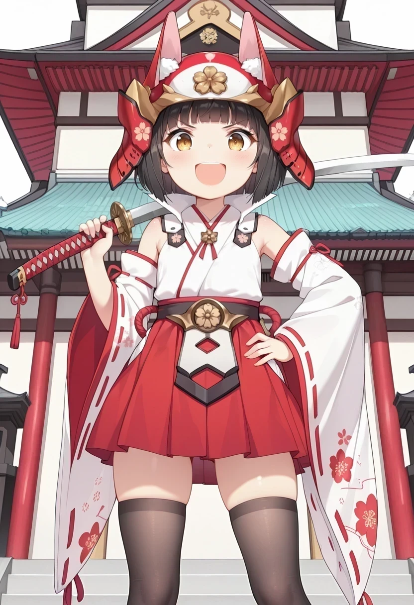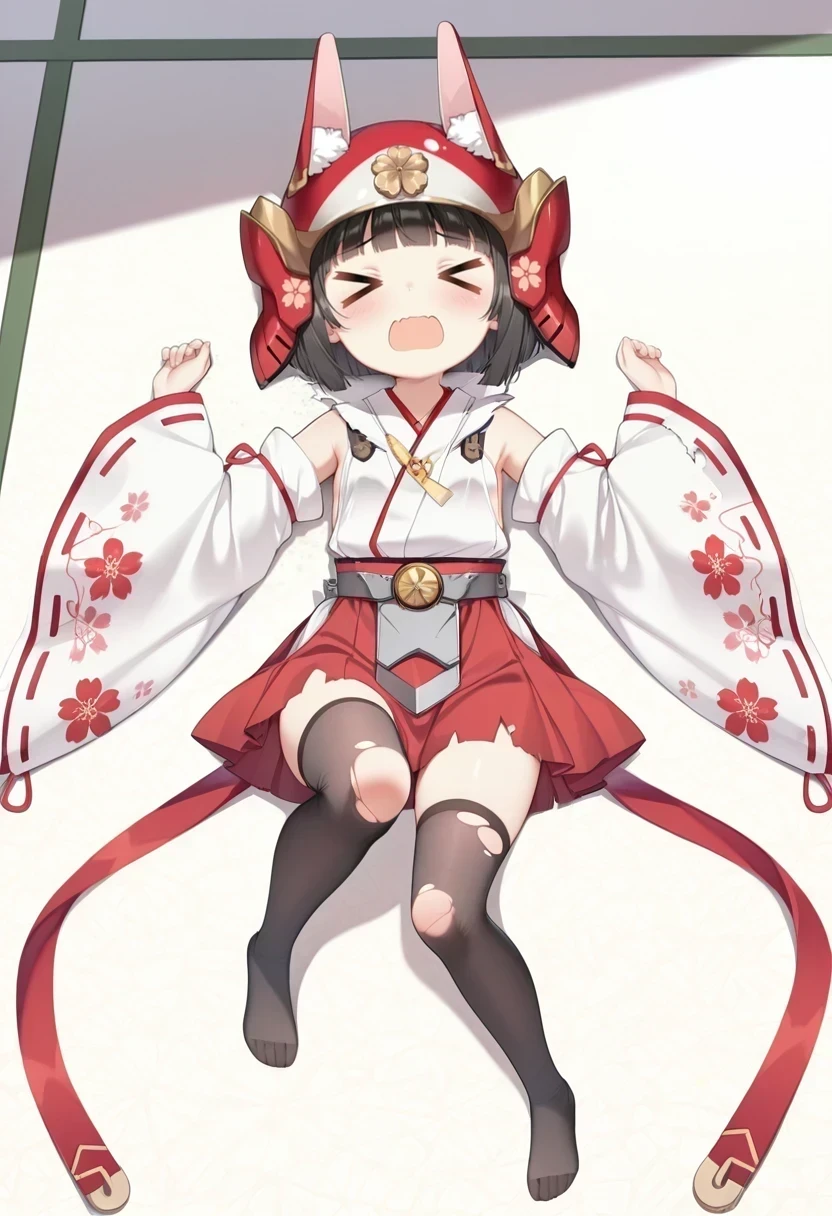 japanese clothes,red skirt,detached sleeves,black thighhighs,ribbon-trimmed sleeves,floral print,helmet,
