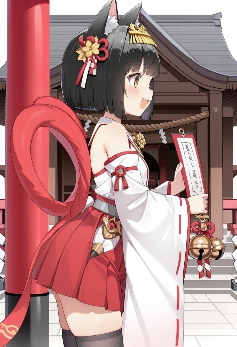 hair ornament,hakama,red skirt,detached sleeves,bare shoulders,black thighhighs,straight hair,red hagoromo,yellow ornament,ribbon-trimmed sleeves,
