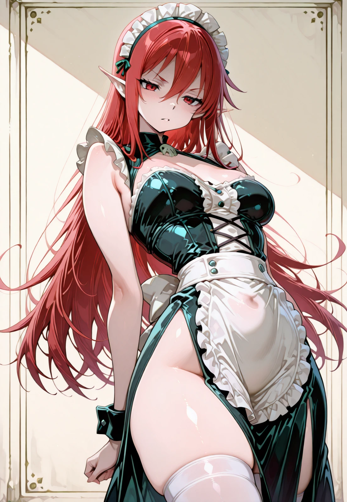 fantasy elf, long red hair, sharp red eyes, red eyebrows, pointed elf ears, freckles, pubic hair