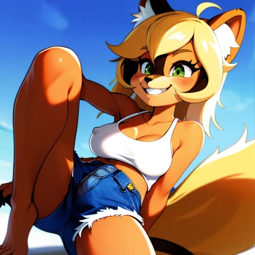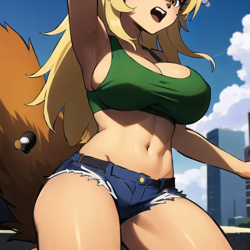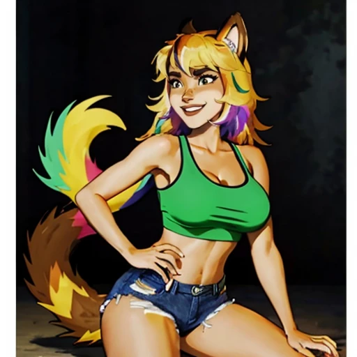 2. Callie, furry female, animal tail, body fur, multicolored fur, furry, brown fur, denim shorts, dark skinned female, brown skin, long hair, animal ears