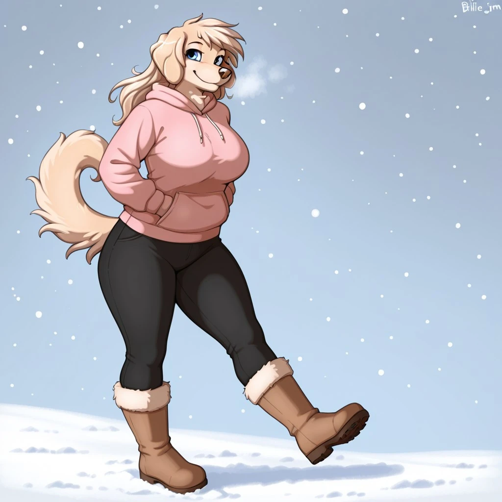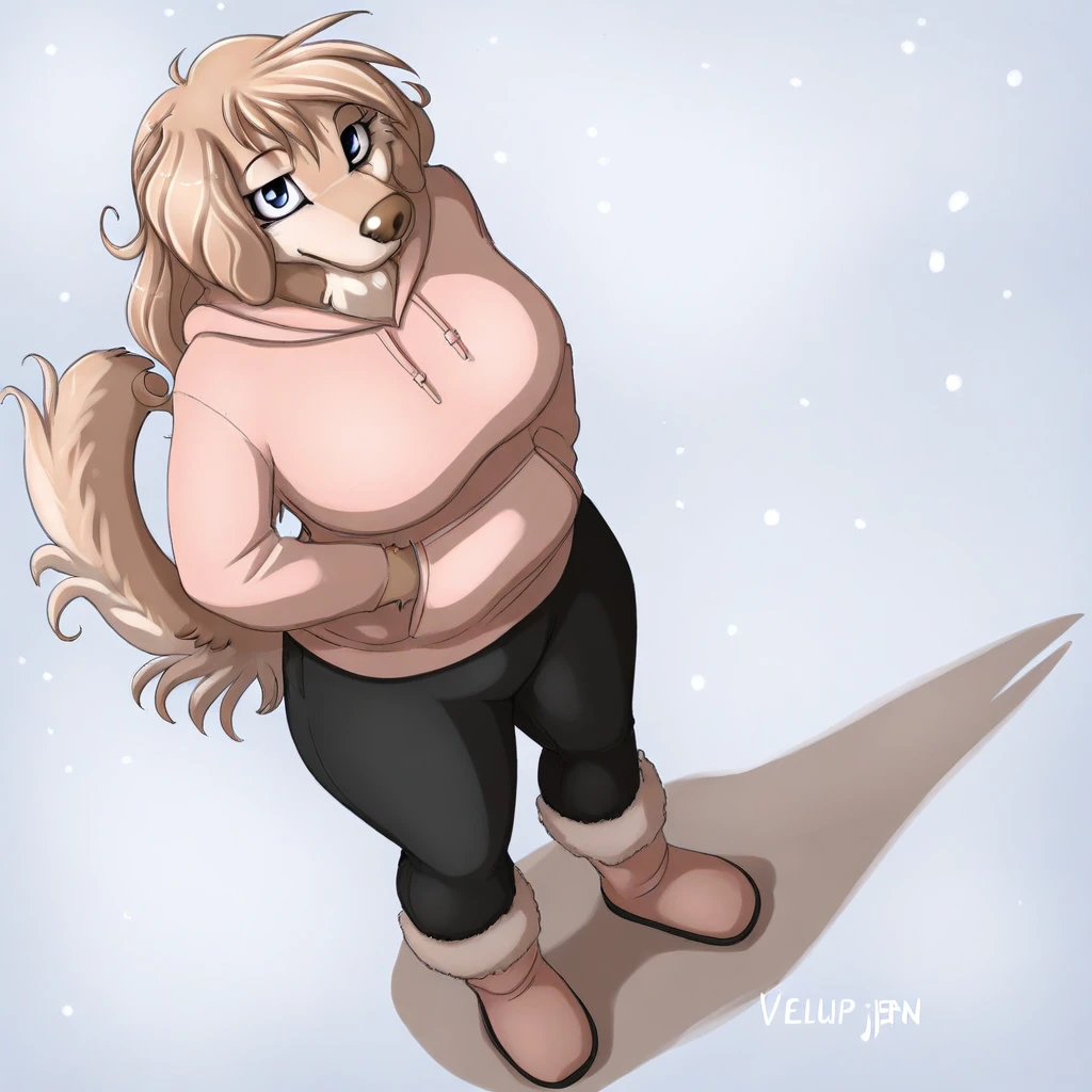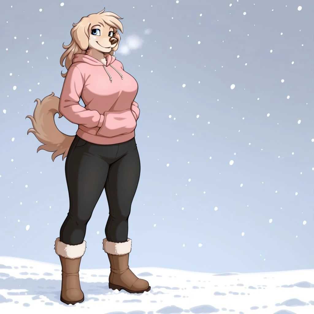 dog, dog girl, Labrador retriever, tan fur, long hair, blue eyes, brown nose, dog ears, dog tail, voluptuous body, large breasts,