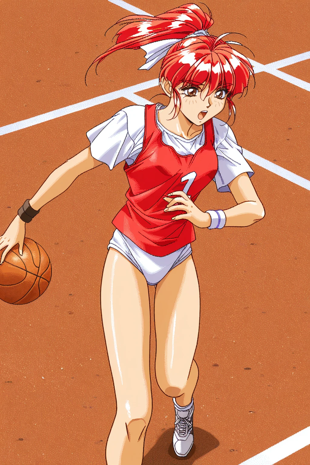 izyi power slave,game cg,oekaki,1990s,Oda Manami,1girl,solo,red hair,ponytail,brown eyes,headband,large breasts,red tank top,white shirt,short sleeves,white buruma,wristband,sneakers,basketball,