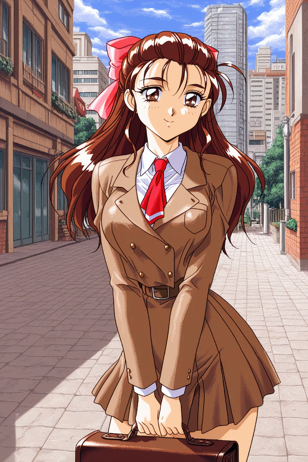 izyi power slave,game cg,oekaki,1990s,Natsue,1girl,solo,brown hair,long hair,half updo,hair bow,pink headwear,brown eyes,large breasts,red necktie,short necktie,brown school uniform jacket,long sleeves,belt,pleated skirt,loafers,v arms,holding,school briefcase,