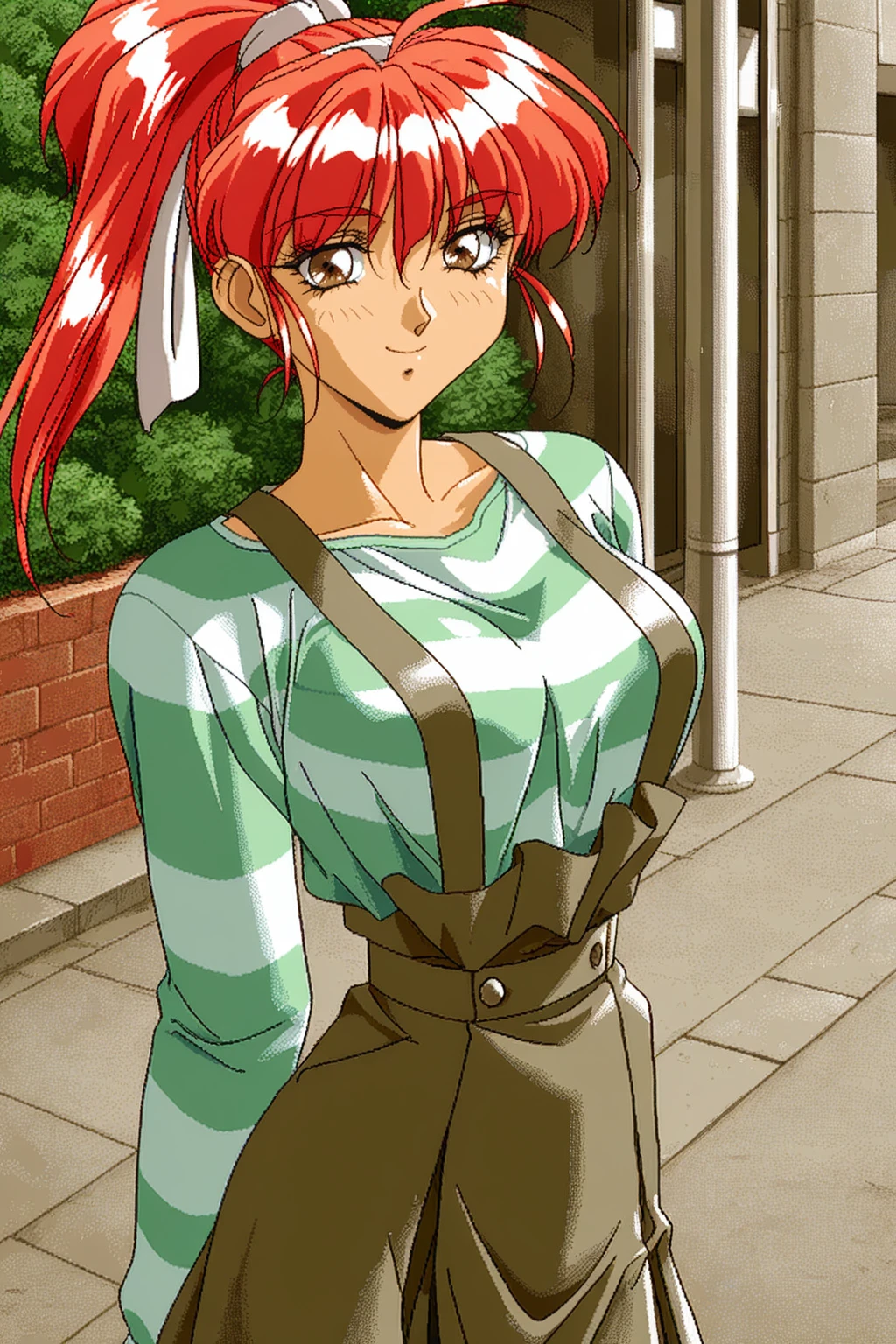 izyi power slave,game cg,oekaki,1990s,Oda Manami,1girl,solo,red hair,ponytail,brown eyes,headband,large breasts,green striped shirt,long sleeves,suspender skirt,sneakers,