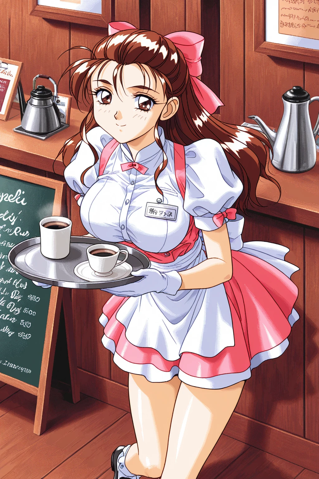 izyi power slave,game cg,oekaki,1990s,Natsue,1girl,solo,brown hair,long hair,half updo,hair bow,pink headwear,brown eyes,large breasts,dress,pink bow,waist apron,white puffy short sleeves,puffy sleeves,name tag,white gloves,bobby socks,mary janes,