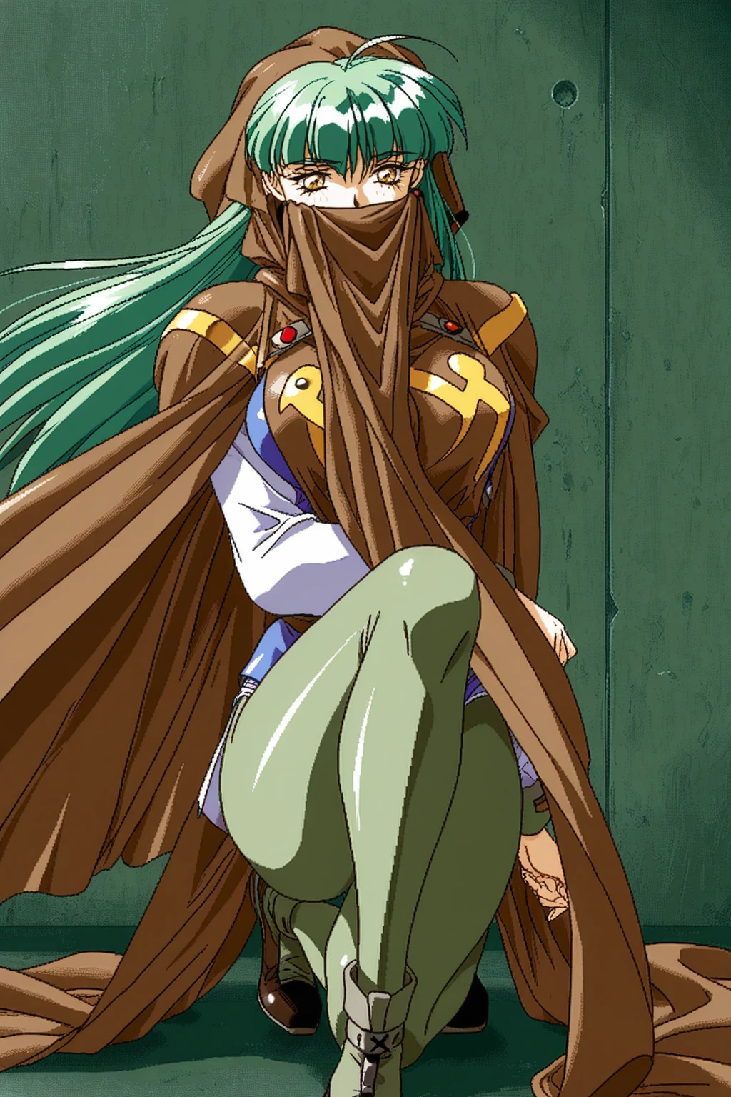 izyi power slave,game cg,oekaki,1990s,Kaori,1girl,solo,long hair,green hair,ahoge,yellow eyes,large breasts,brown hooded cloak,covered mouth,hood up,jewelry,pantyhose,shoes,