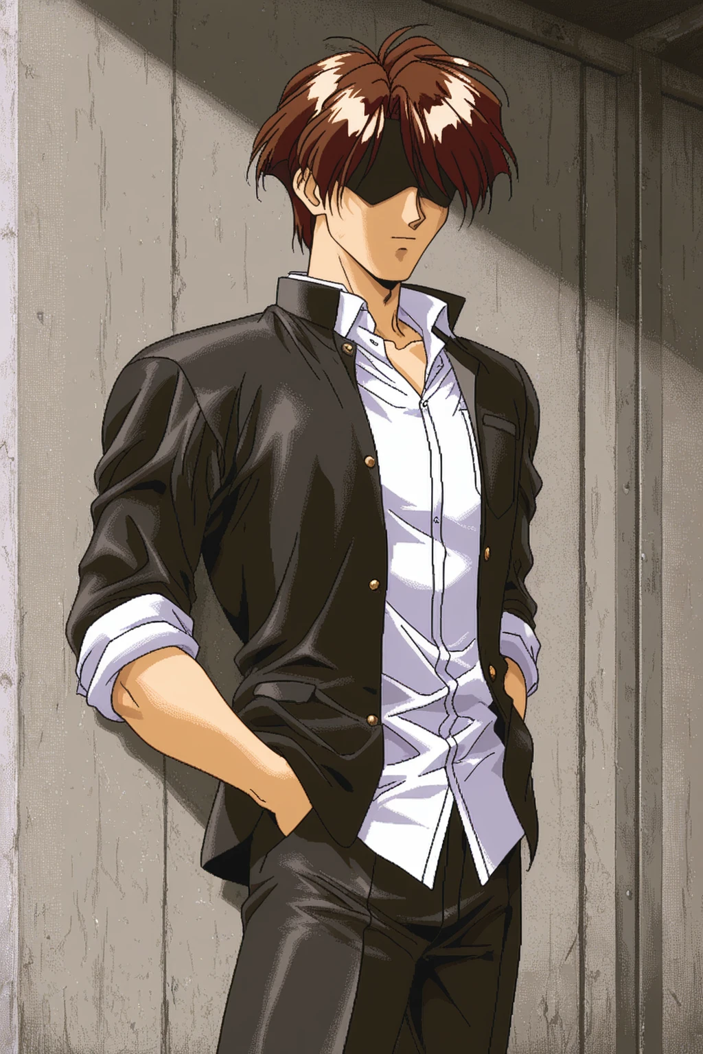 izyi power slave,game cg,oekaki,1990s,Shujinko,1boy,solo,brown hair,short hair,eyeless male,school uniform,black jacket,sleeves rolled up,popped collar,open clothes,white shirt,collared shirt,beltless,pants,shoes,