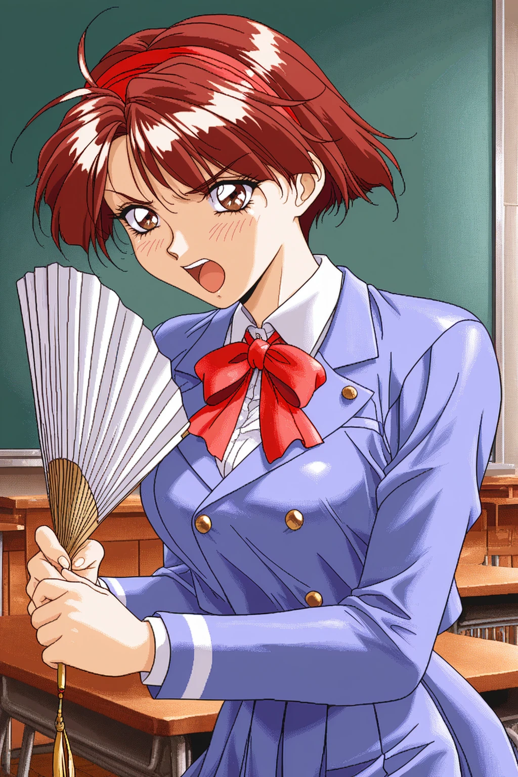 izyi power slave,game cg,oekaki,1990s,Yokoyama Rika,1girl,solo,brown hair,short hair,brown eyes,red hair band,breasts,blue school uniform jacket,white shirt,long sleeves,red bow,shirt,blue skirt,pleated skirt,loafers,holding paper folding fan,raised fan,