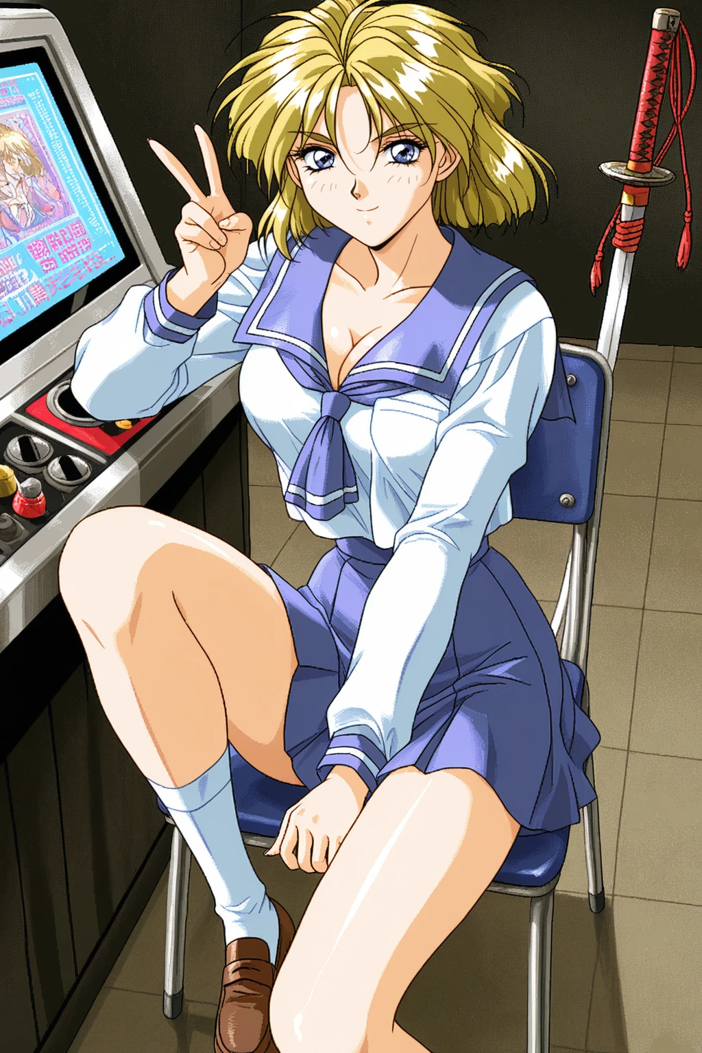 izyi power slave,game cg,oekaki,1990s,Ichinose Naomi,1girl,solo,blonde hair,short hair,blue eyes,large breasts,cleavage,school uniform,blue sailor collar,serafuku,long sleeves,skirt,loafers,smile,sitting,weapon,sword,