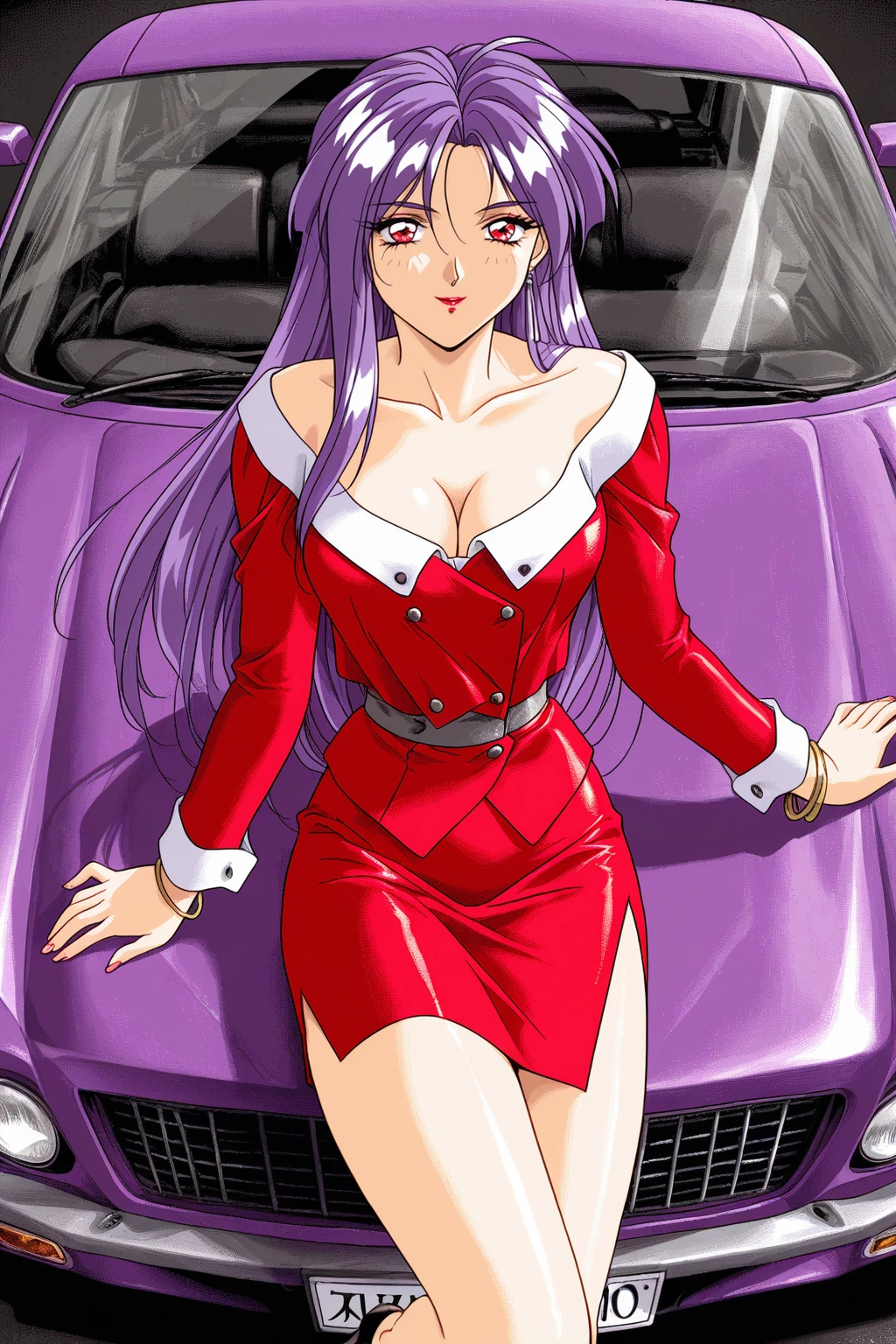 izyi power slave,game cg,oekaki,1990s,Ayumi,1girl,solo,purple hair,long hair,red eyes,lipstick,makeup,breasts,collarbone,cleavage,jewelry,earrings,bracelet,red skirt suit,girdle,pencil skirt,high heels,