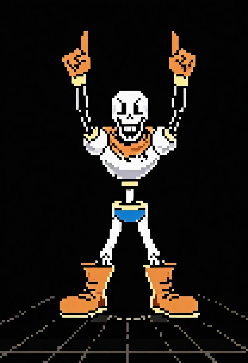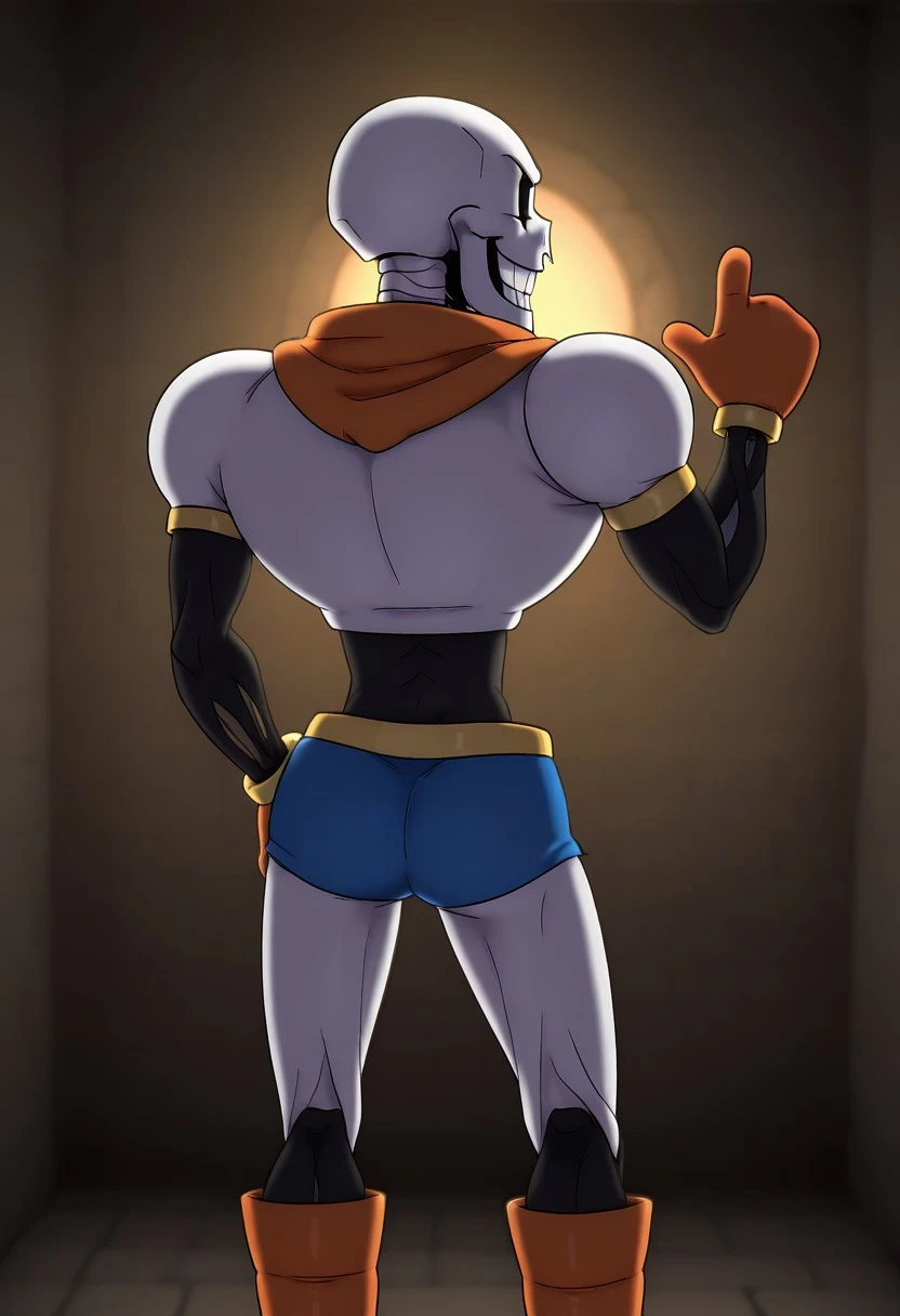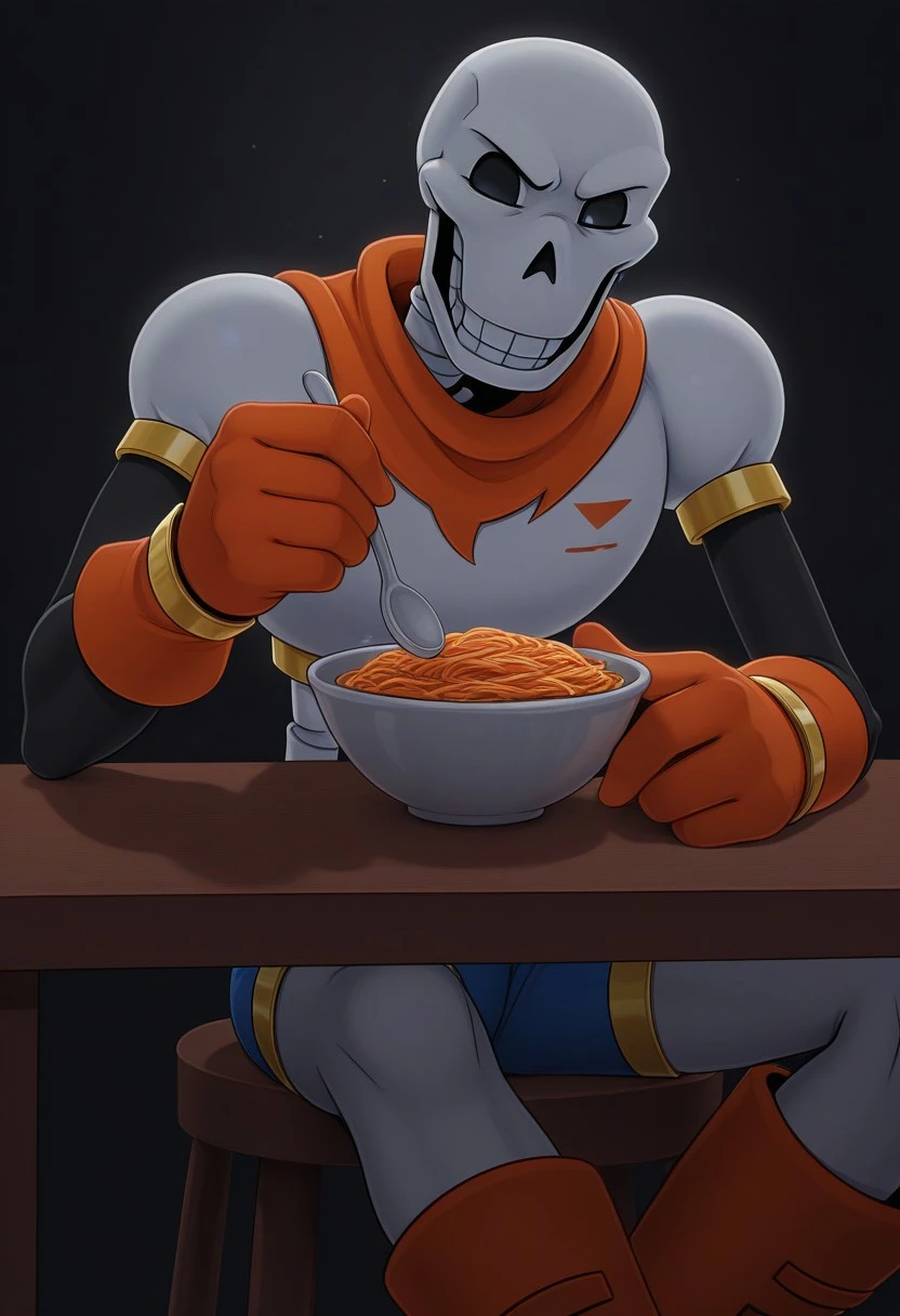 Papyrus the Skeleton, white skin, black sclera, no pupils, hole in place of nose, tall, orange scarf, blue shorts, black arms and legs, orange gloves, orange boots