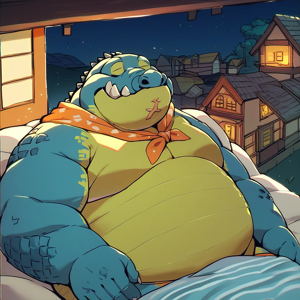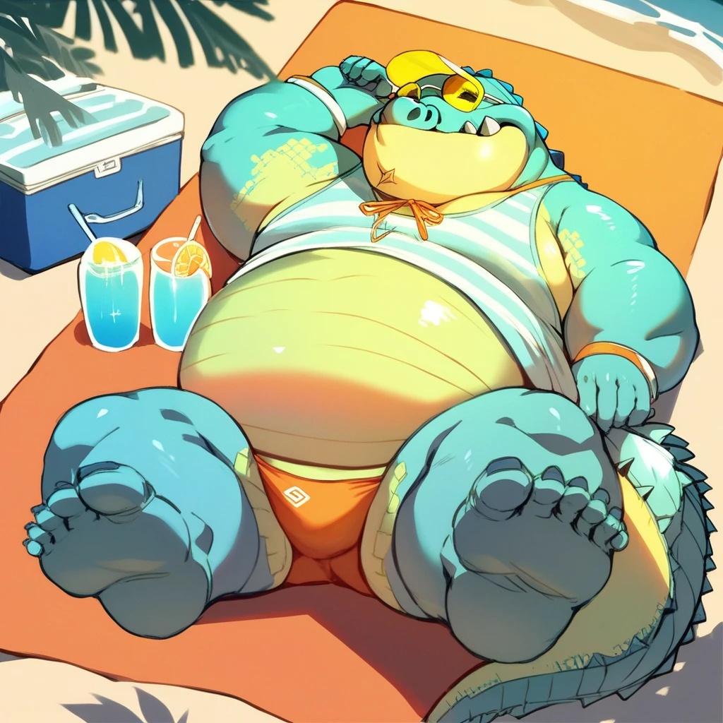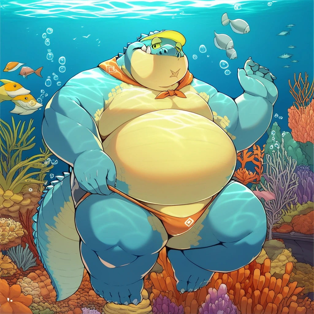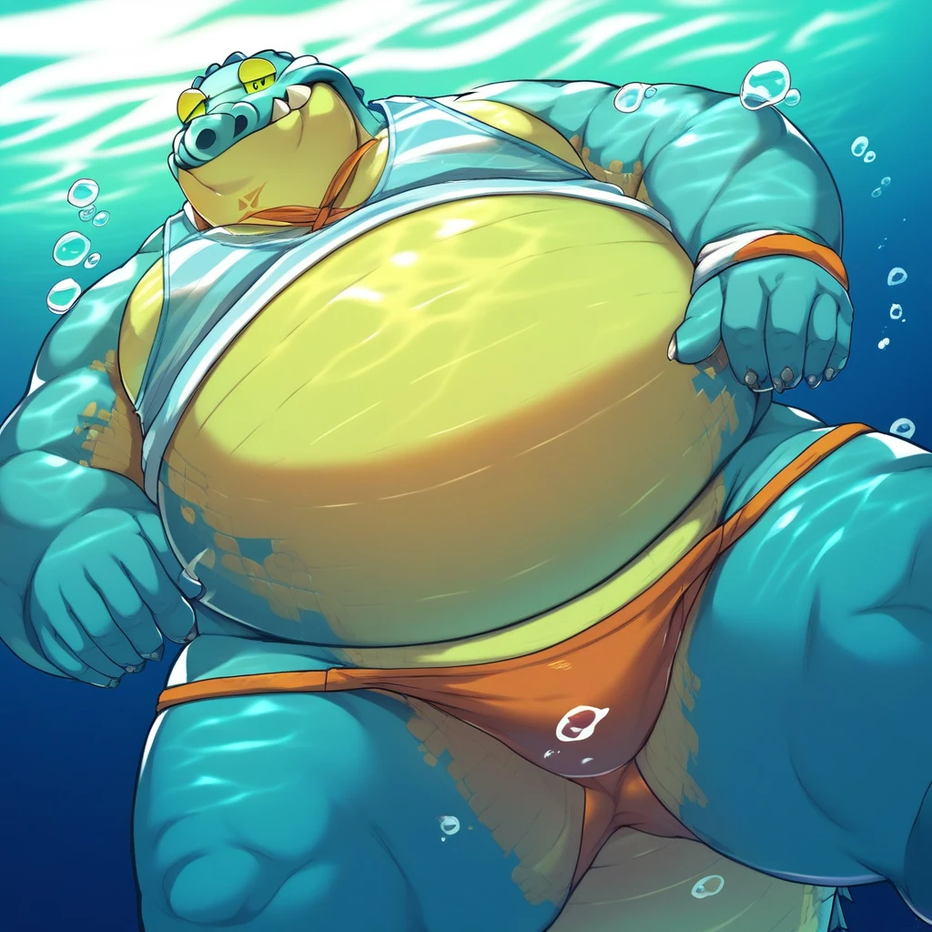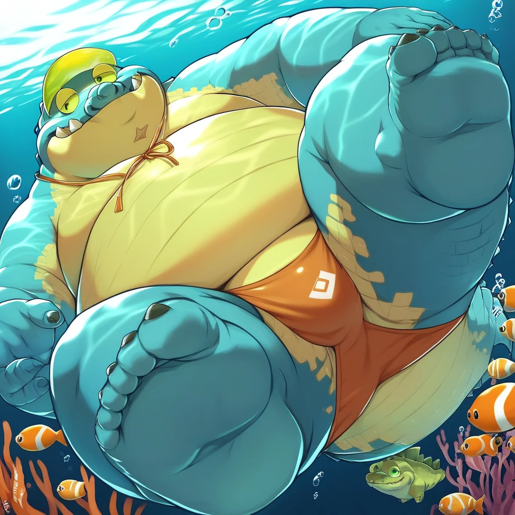 Best Positive Input: (makara, housamo, blue and yellow skin, anthro, crocodile, fat, obese, five toes, yellow eyes)