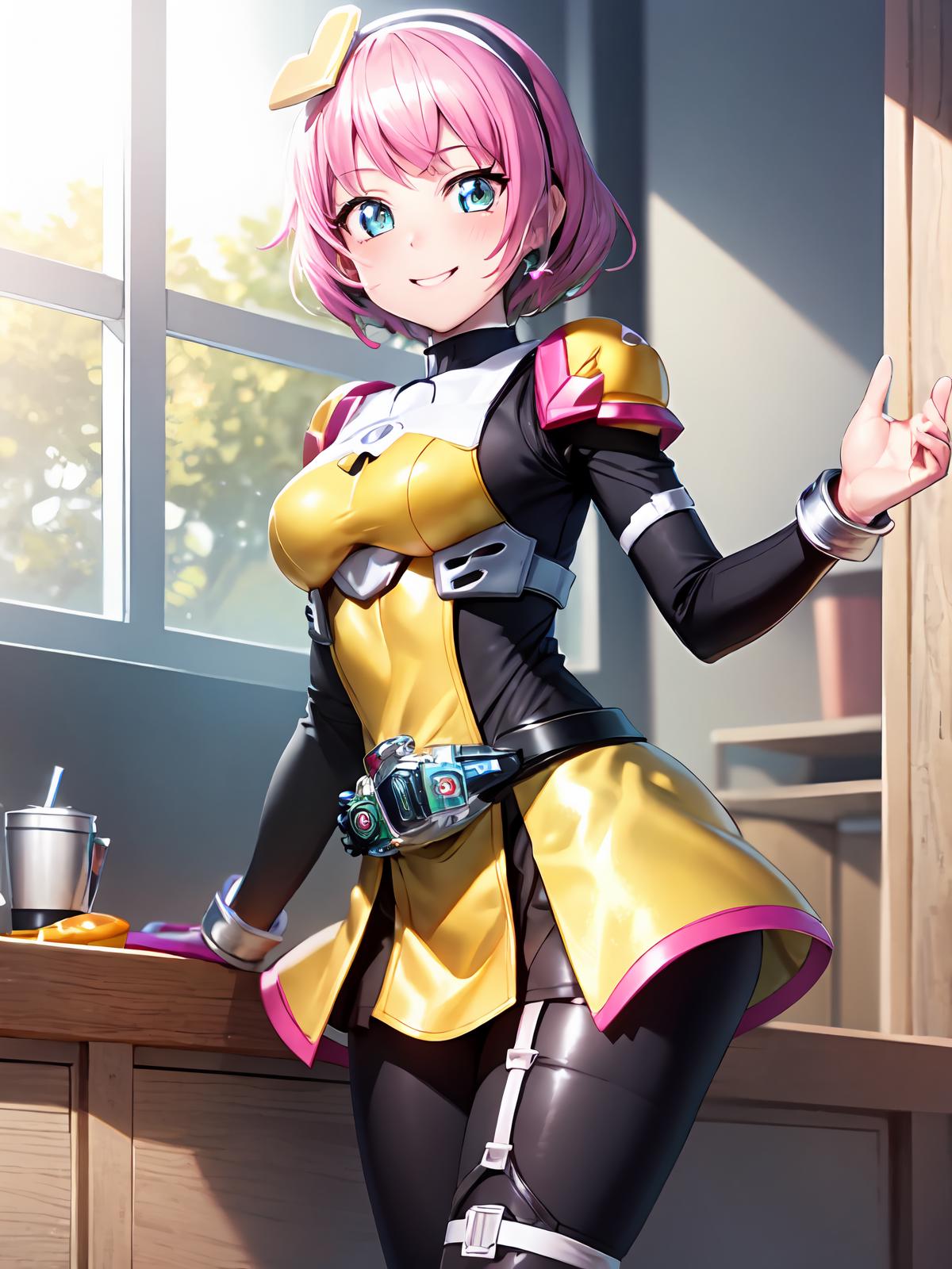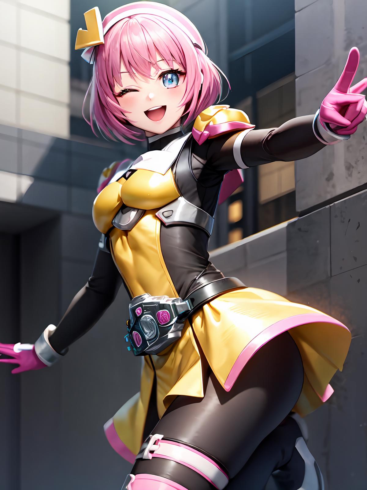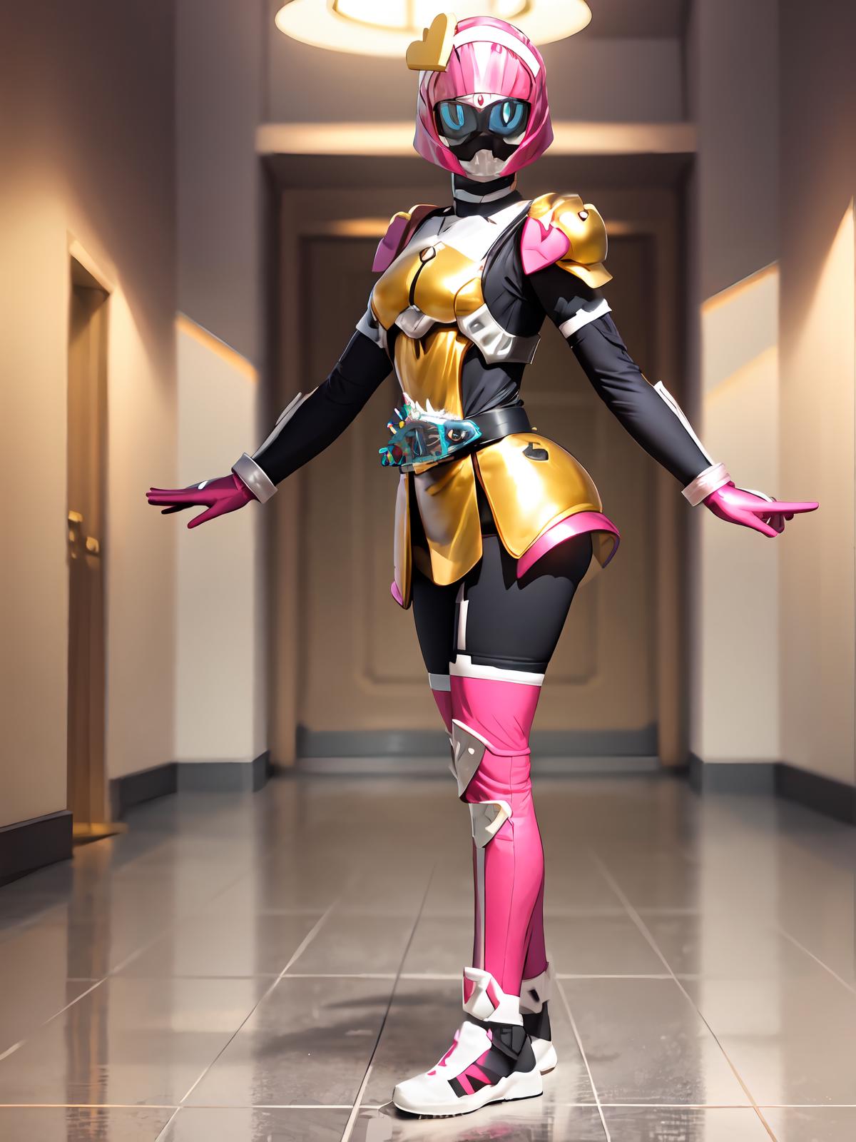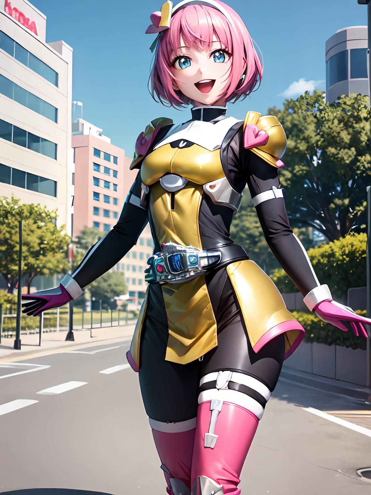 Prompts: pink footwear, pink gloves,boots blue eyes, bodysuit,heart helmet, belt,armor,mask,rider belt,boots