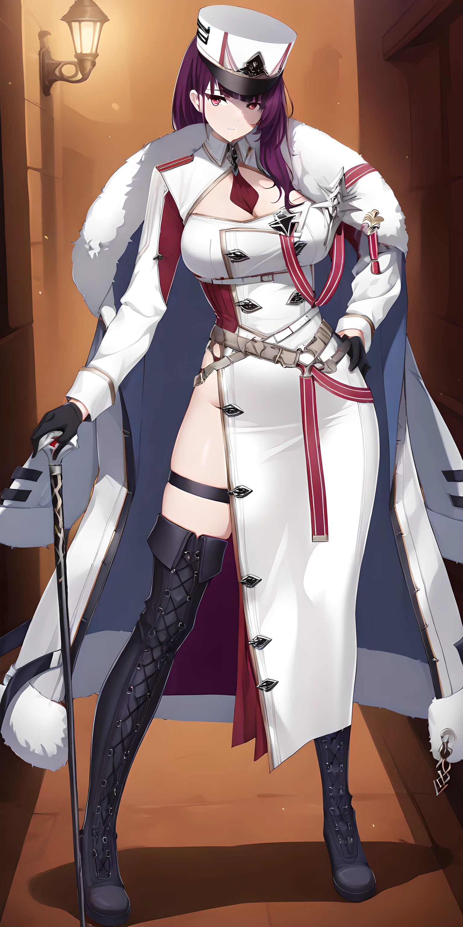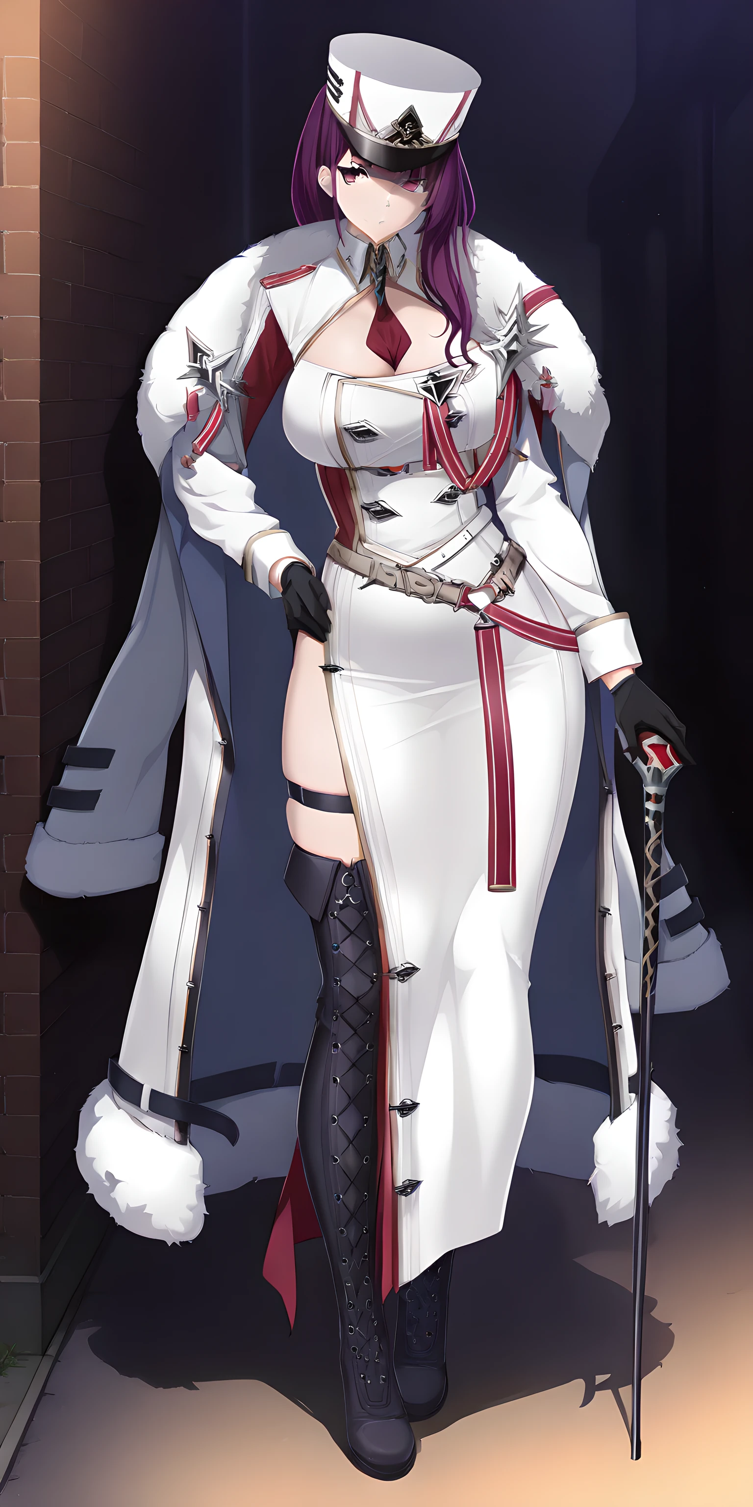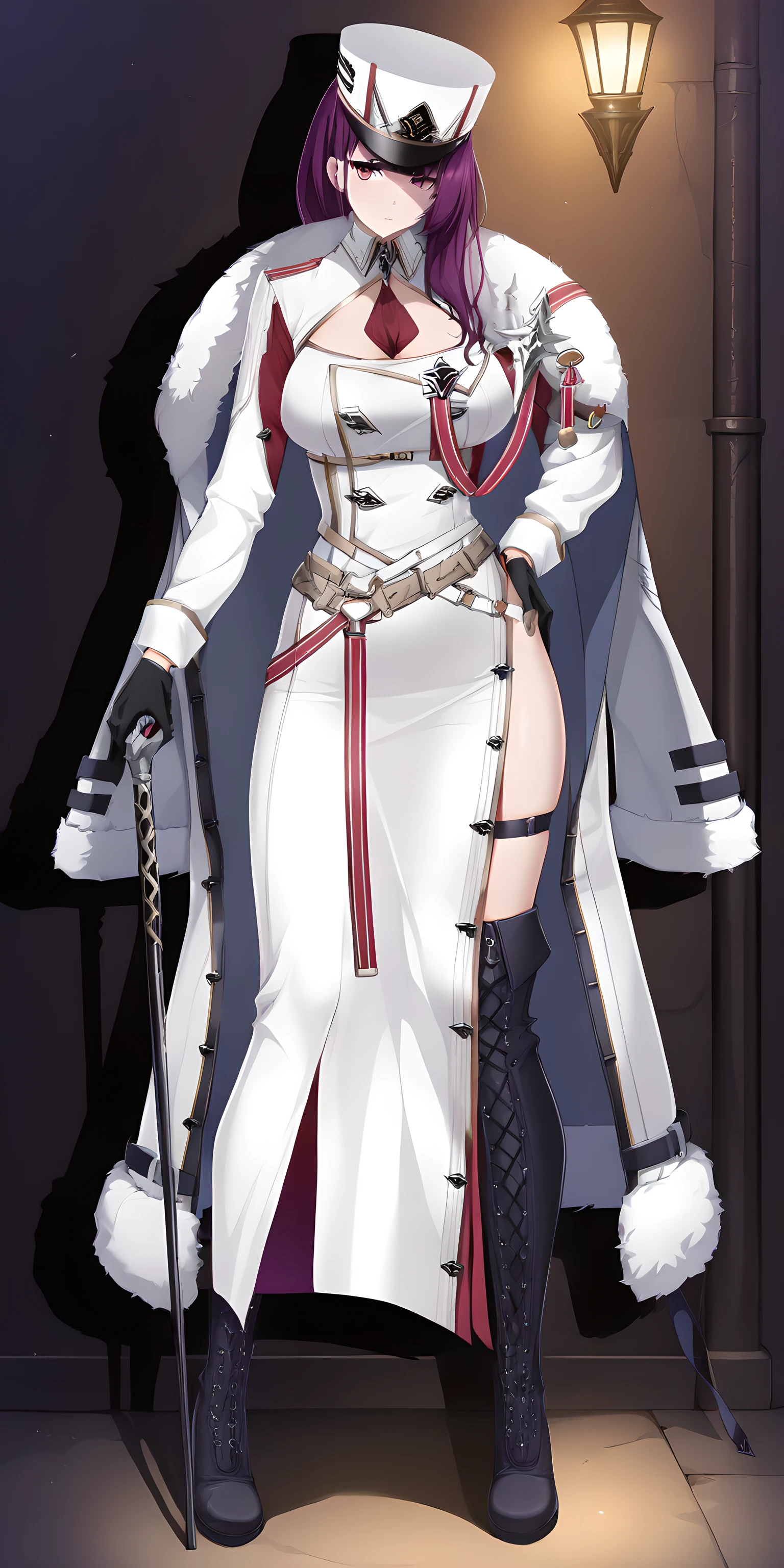 Activation tag is "felix(counterside), long hair, mole under eye, purple hair, purple eyes, large breasts", Outfit tag is "hat, gloves, necktie, white headwear, black gloves, fur trim, uniform, white cape, cleavage, white military uniform, military hat, white coat, black footwear, boots".