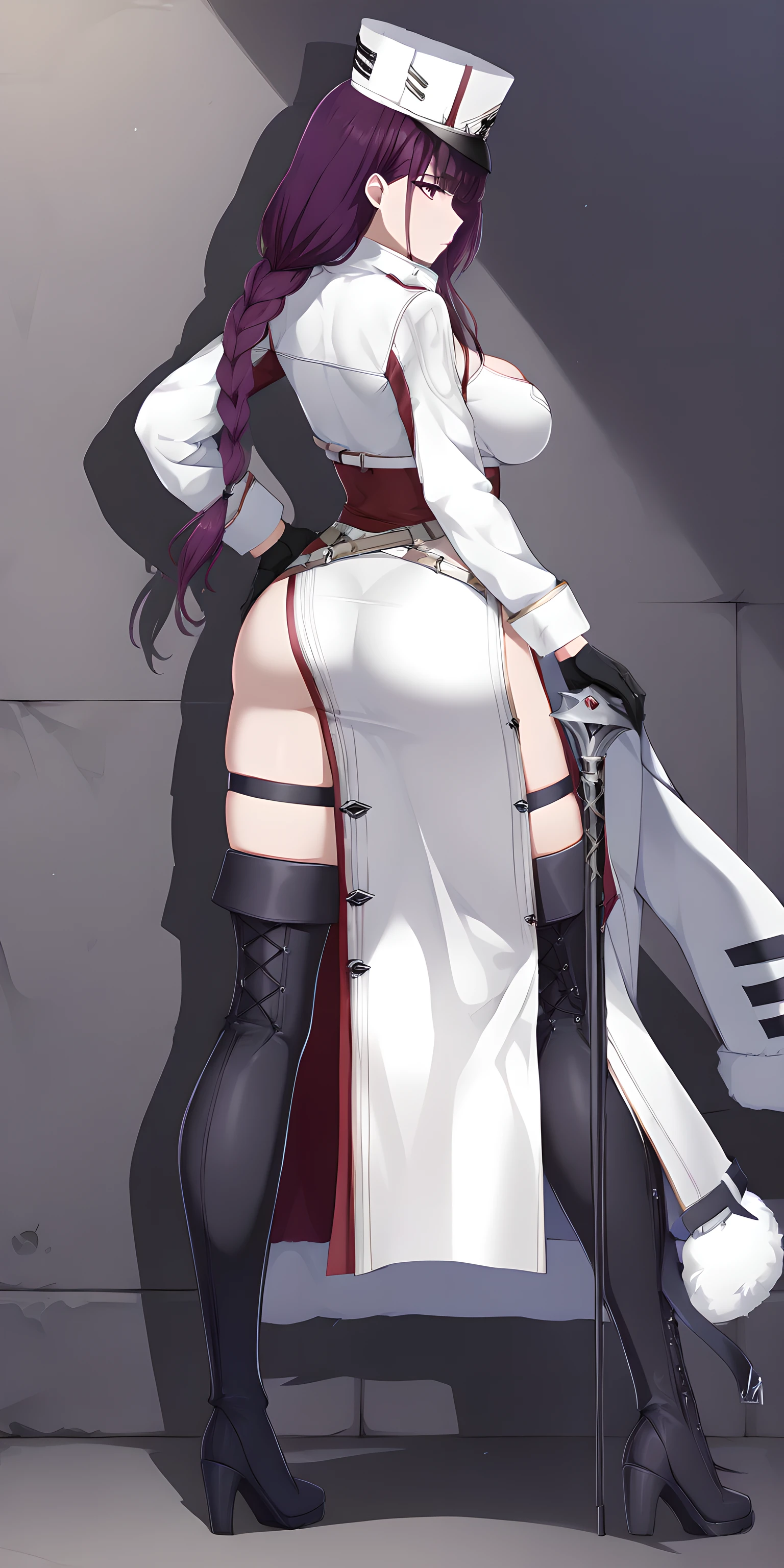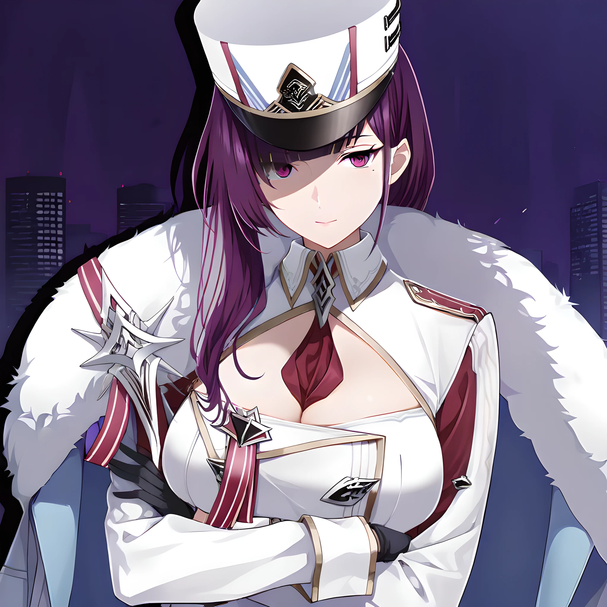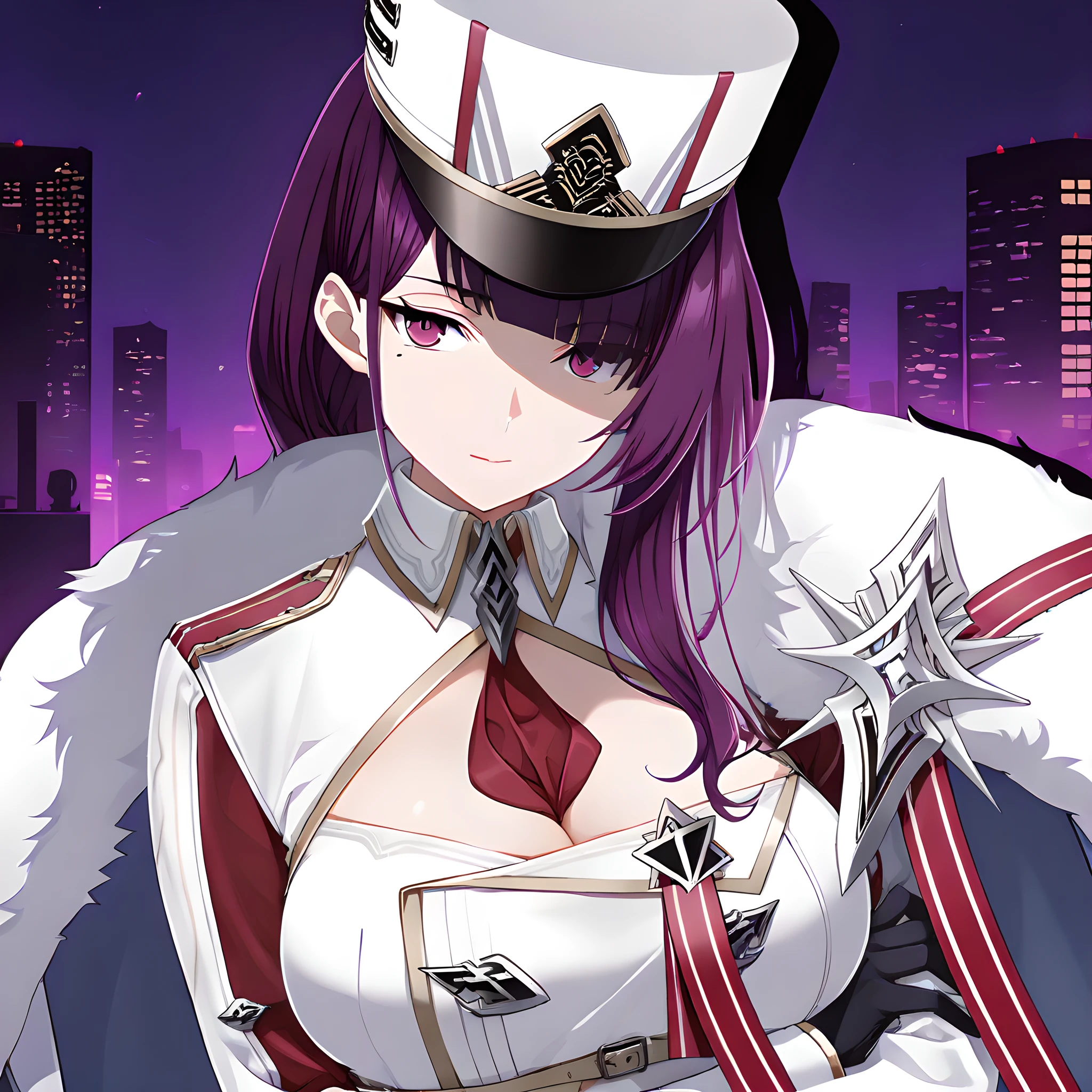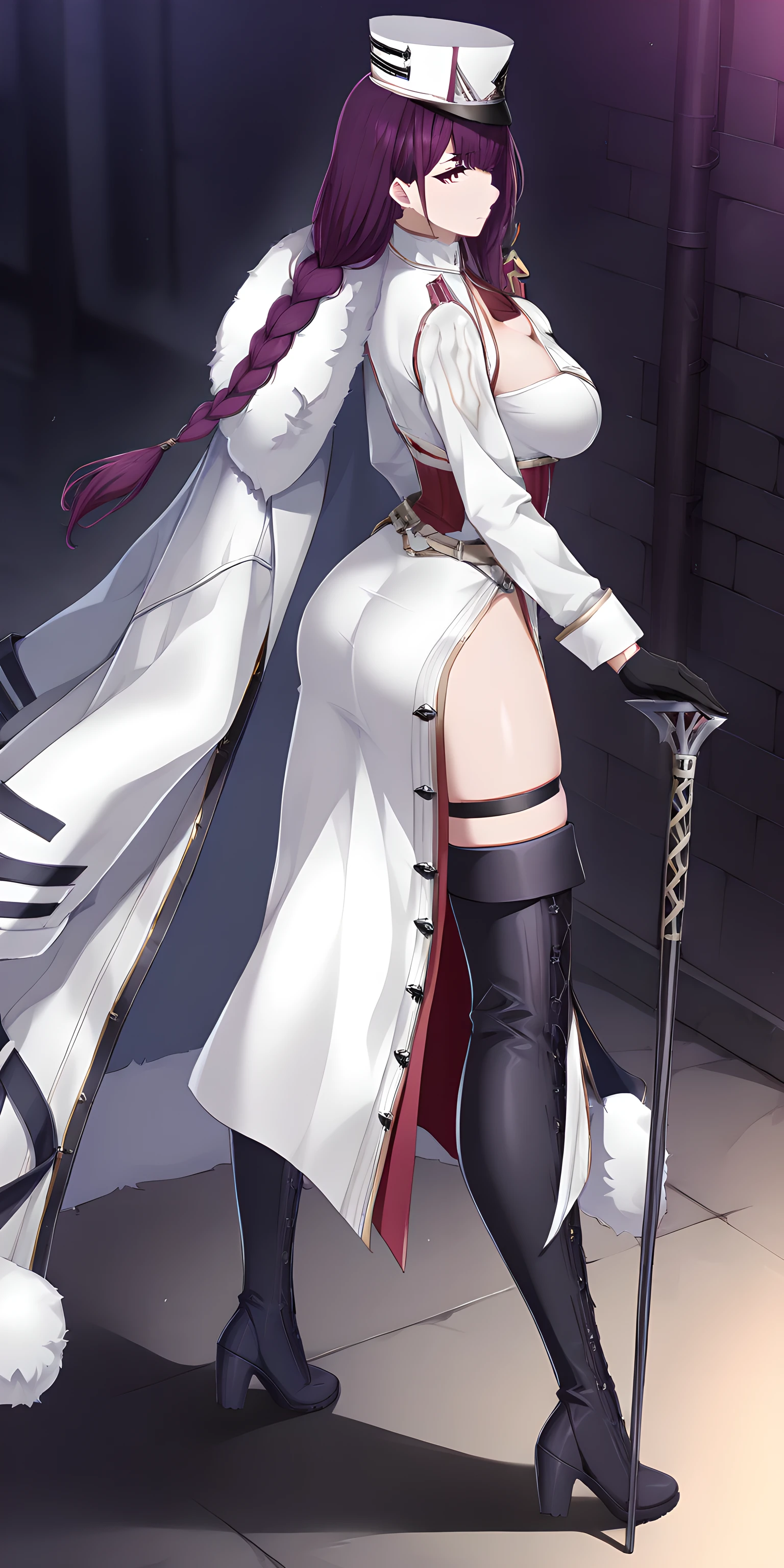 Activation tag is "felix(counterside), long hair, mole under eye, purple hair, purple eyes, large breasts", Outfit tag is "hat, gloves, necktie, white headwear, black gloves, fur trim, uniform, white cape, cleavage, white military uniform, military hat, white coat, black footwear, boots".