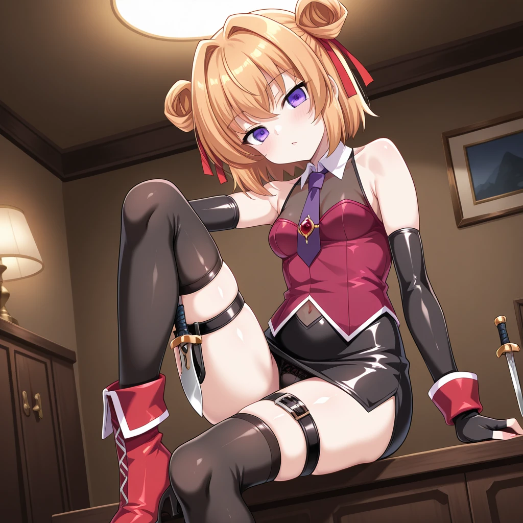 red ribbon,hair ribbon,purple necktie,collared shirt,black see-through,sleeveless shirt,navel,black gloves,fingerless gloves,elbow gloves,black skirt,pencil skirt,thigh belt,knife tied to thigh,black thighhighs,red boots,ankle boots,