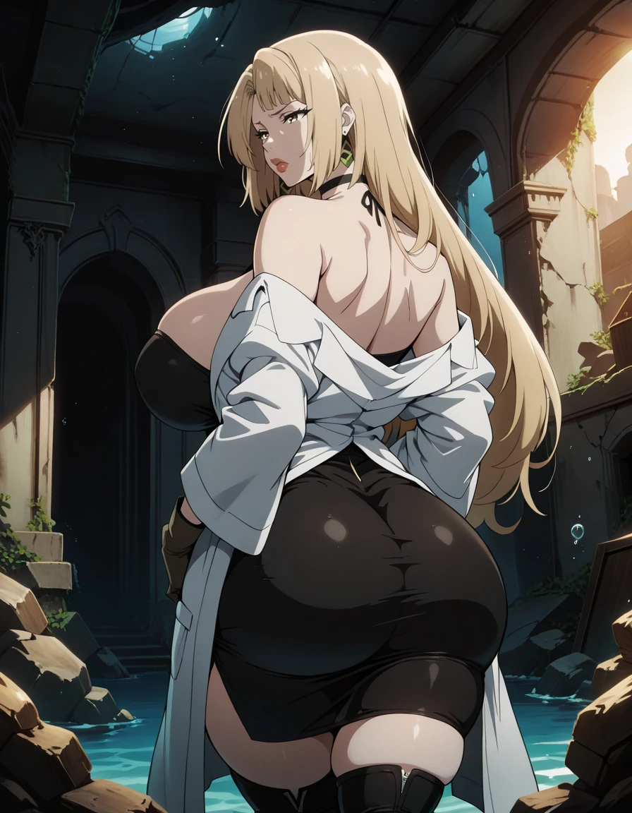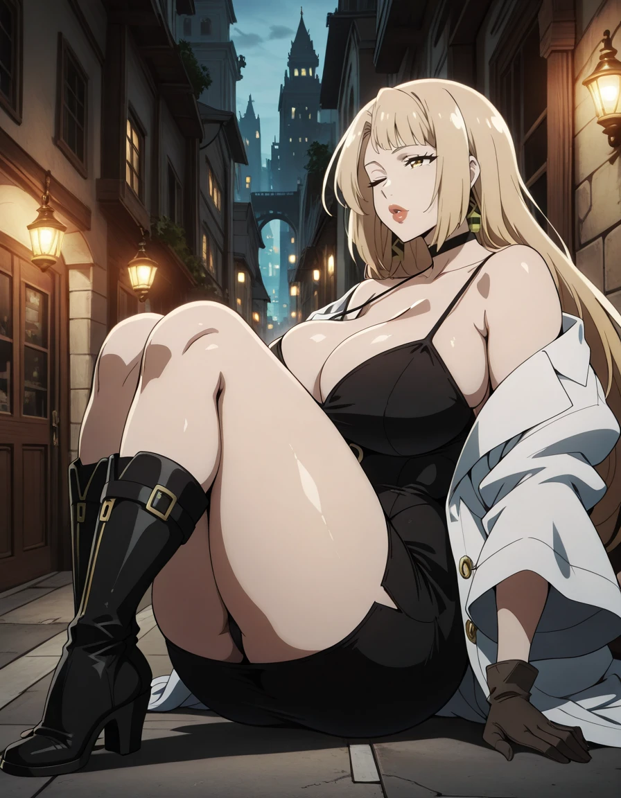 black choker, gloves, strapples_black_dress, white_labcoat, long_hair, blonde hair, yellow_eyes, high heel boots, long_dress