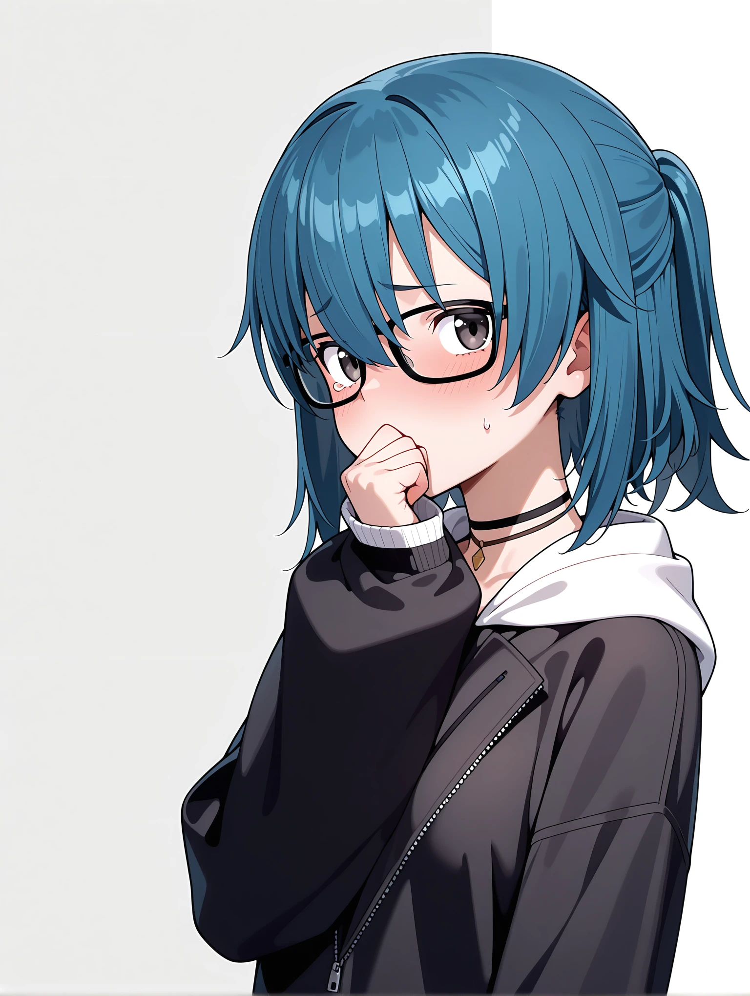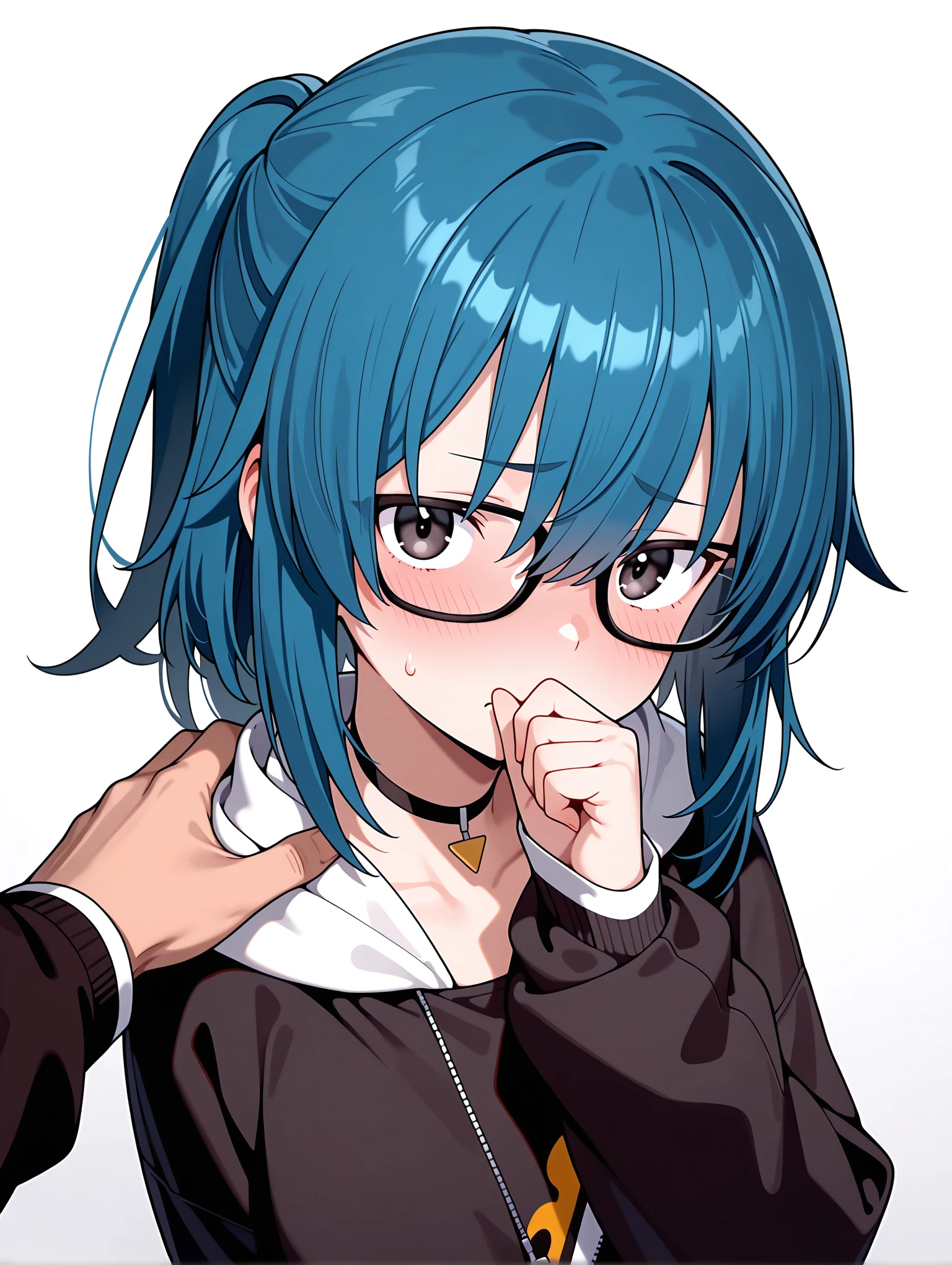 トリガーワード ・i_neo,half up ponytail,blue hair,hair between eyes,black eyes,