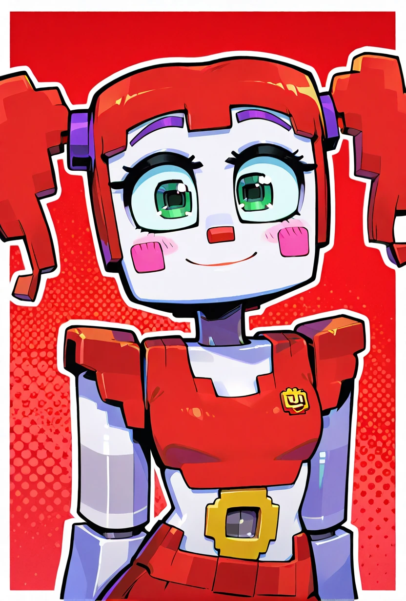 circusbabmc, solo, twintails, robot, 1girl, red hair, green eyes, big eyes, blush stickers, android, red skirt, red crop top, smile, 3d