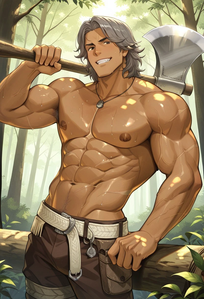 Normal outfit: Atlas_FE, brown eyes, grey hair, muscular male, dark-skinned male, scar, fur trim, fingerless gloves, shoulder armor, brown pants, boots,