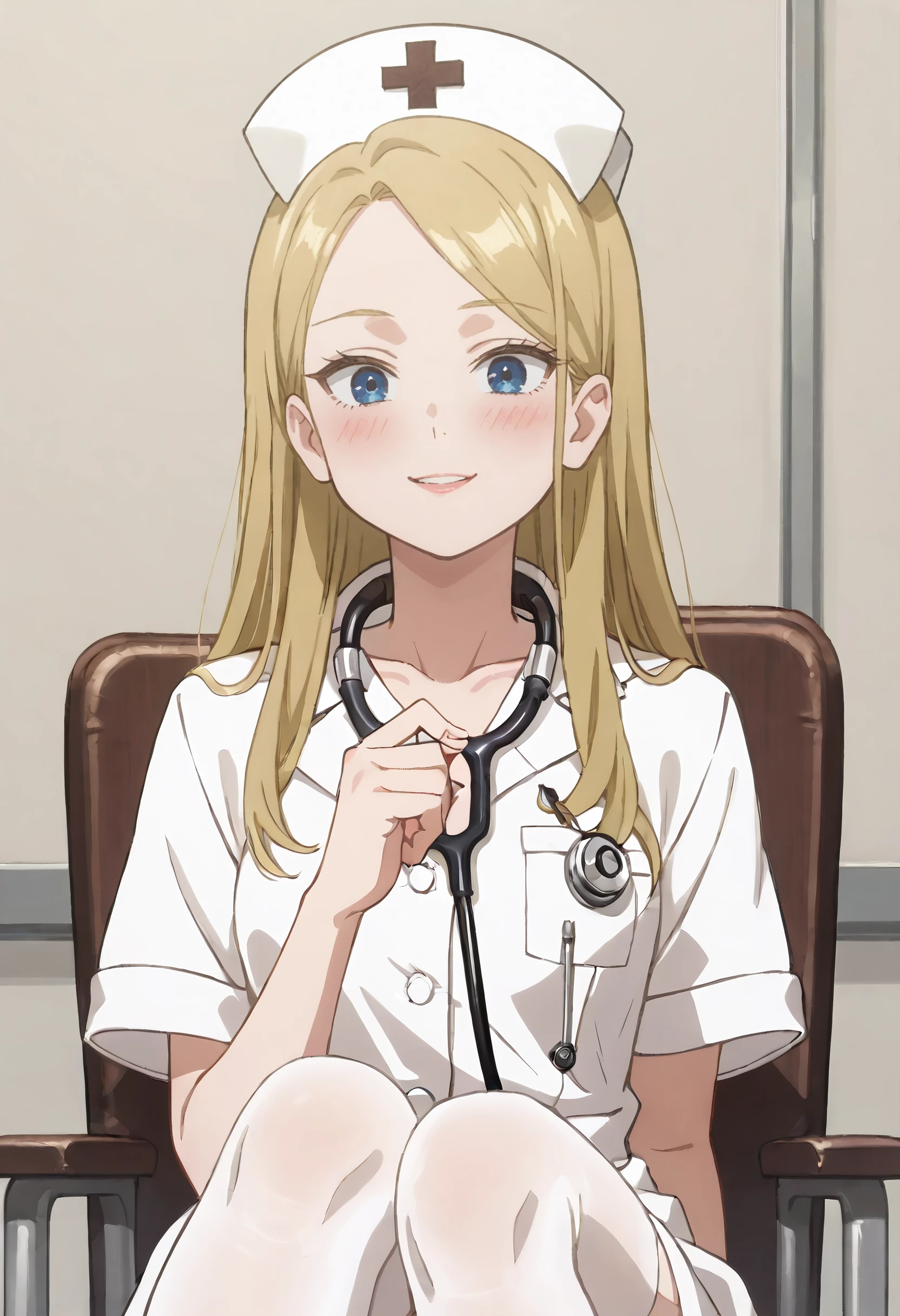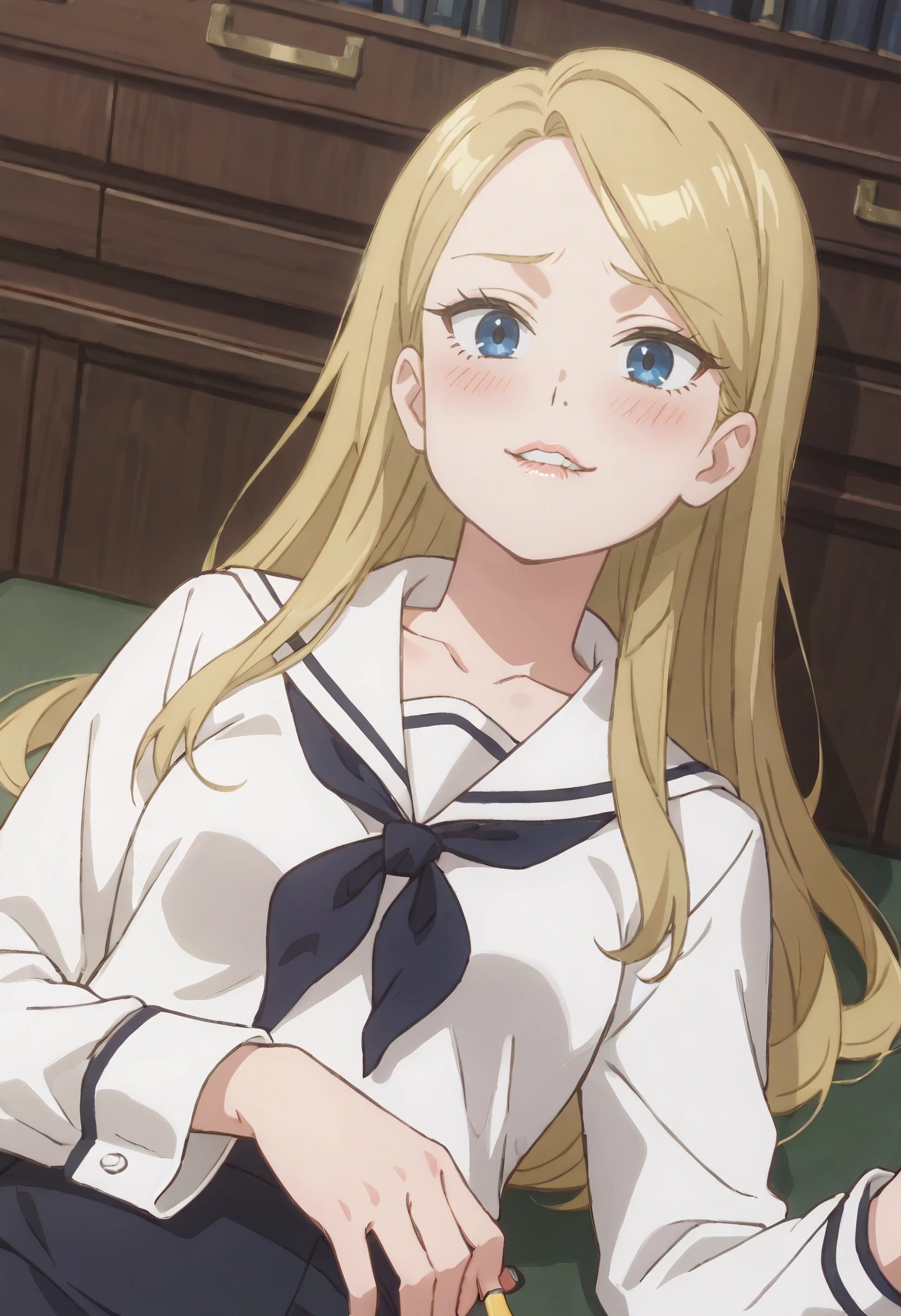 GirReceptionist, long hair, blonde hair, bangs, blue eyes, swept bangs, forehead, parted bangs,
