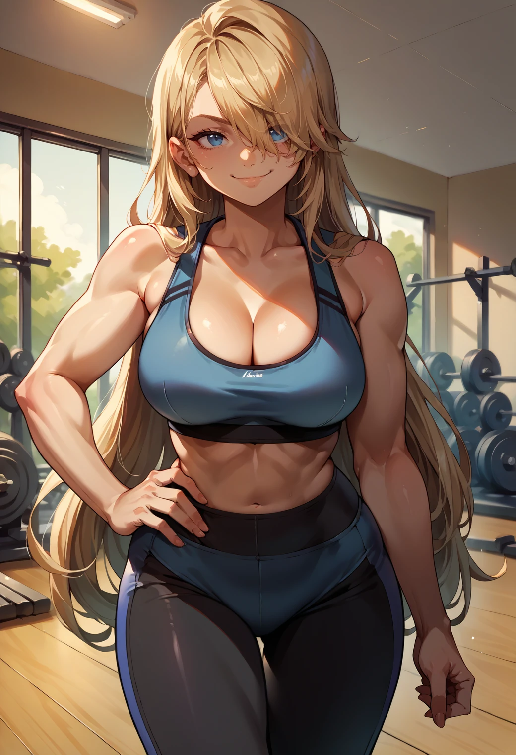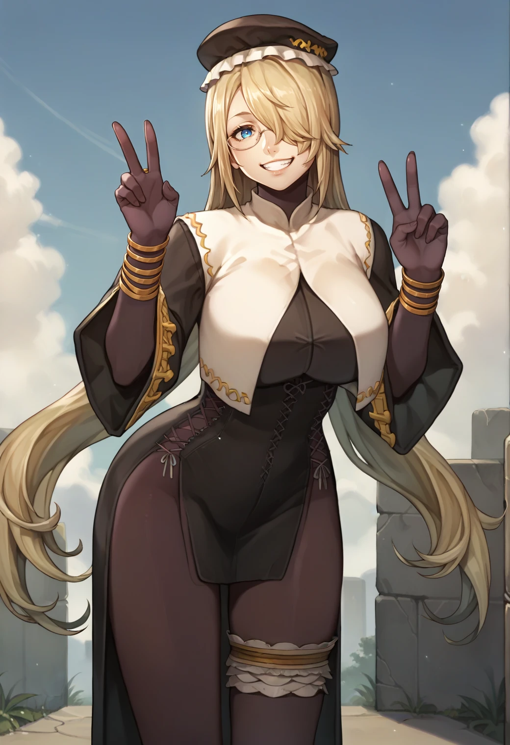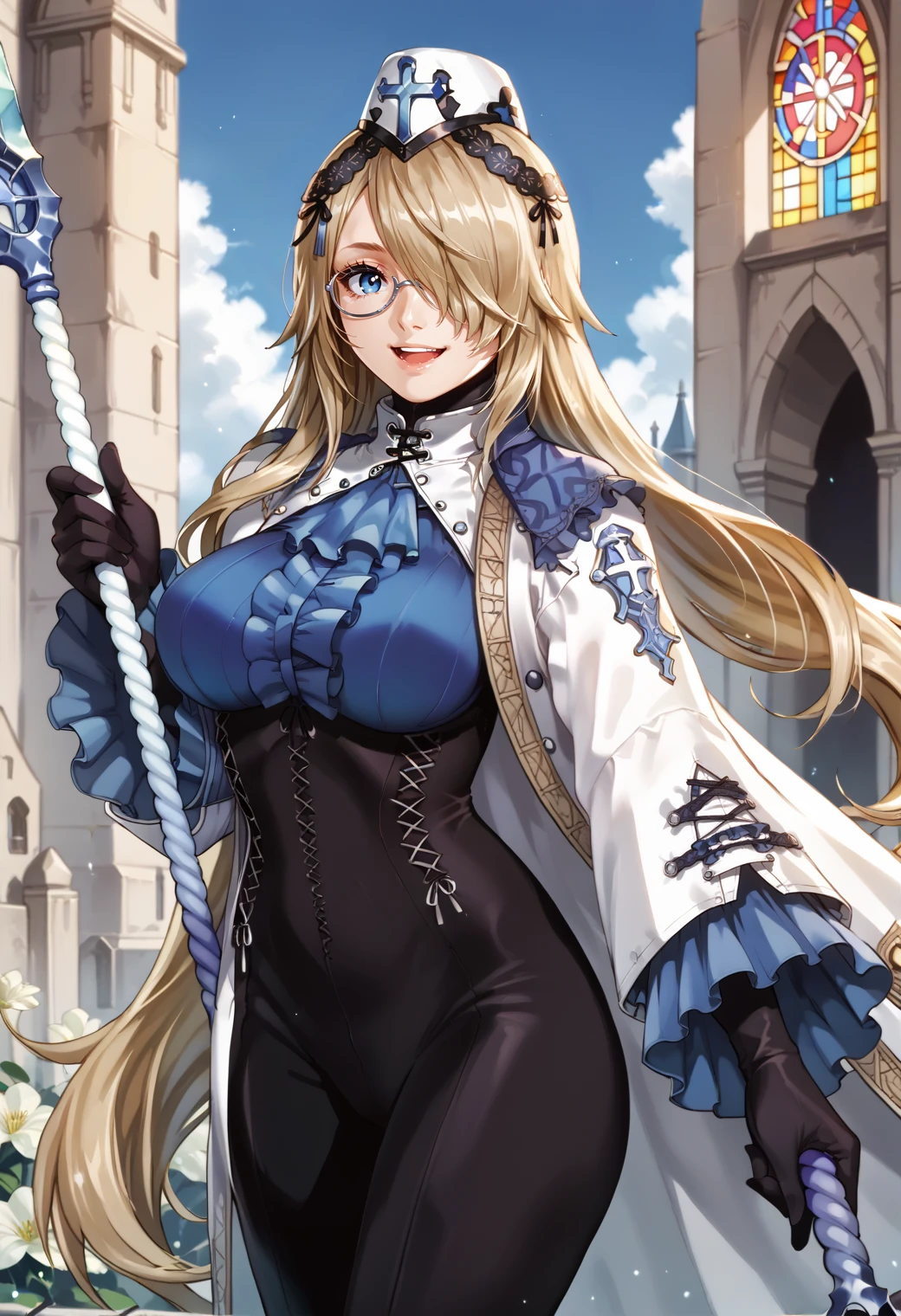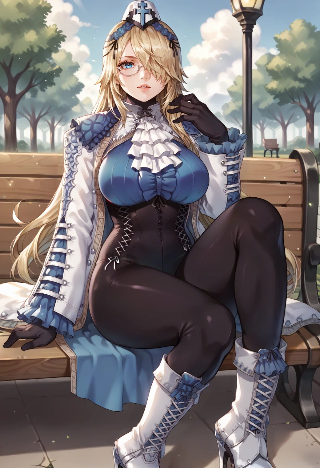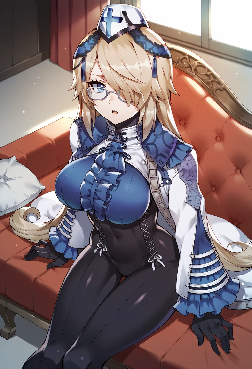 dmCOTM, long hair, garrison cap, hair ornament, hair over one eye, blue eyes, glasses, large breasts, center frills, black bodysuit, white coat, long sleeves, frilled sleeves, black gloves
