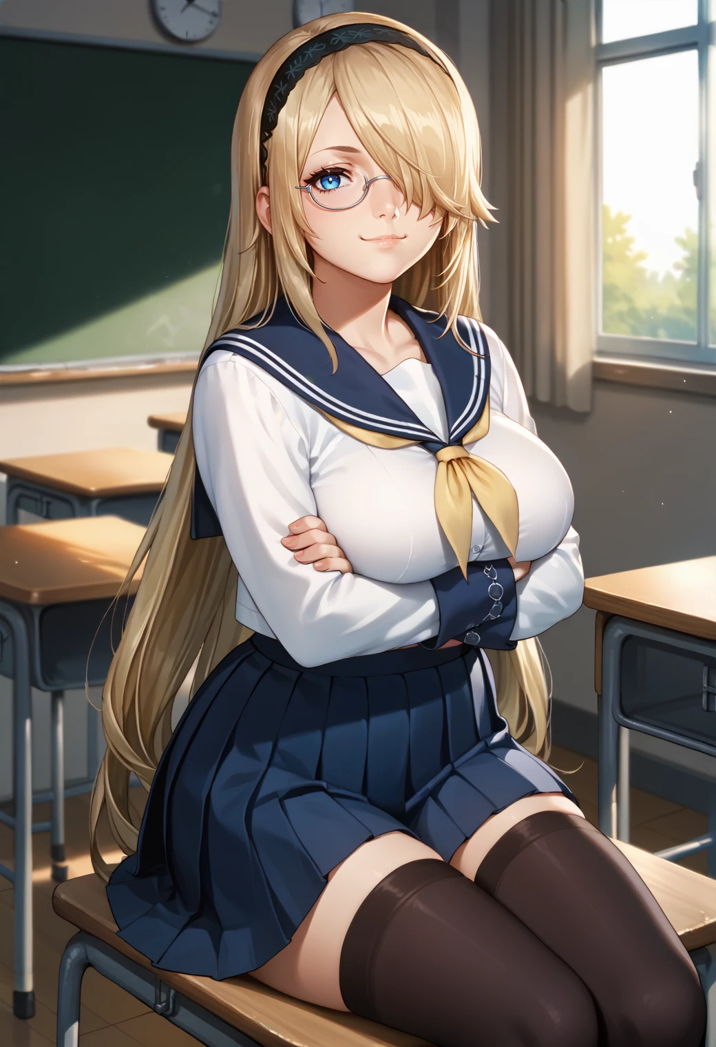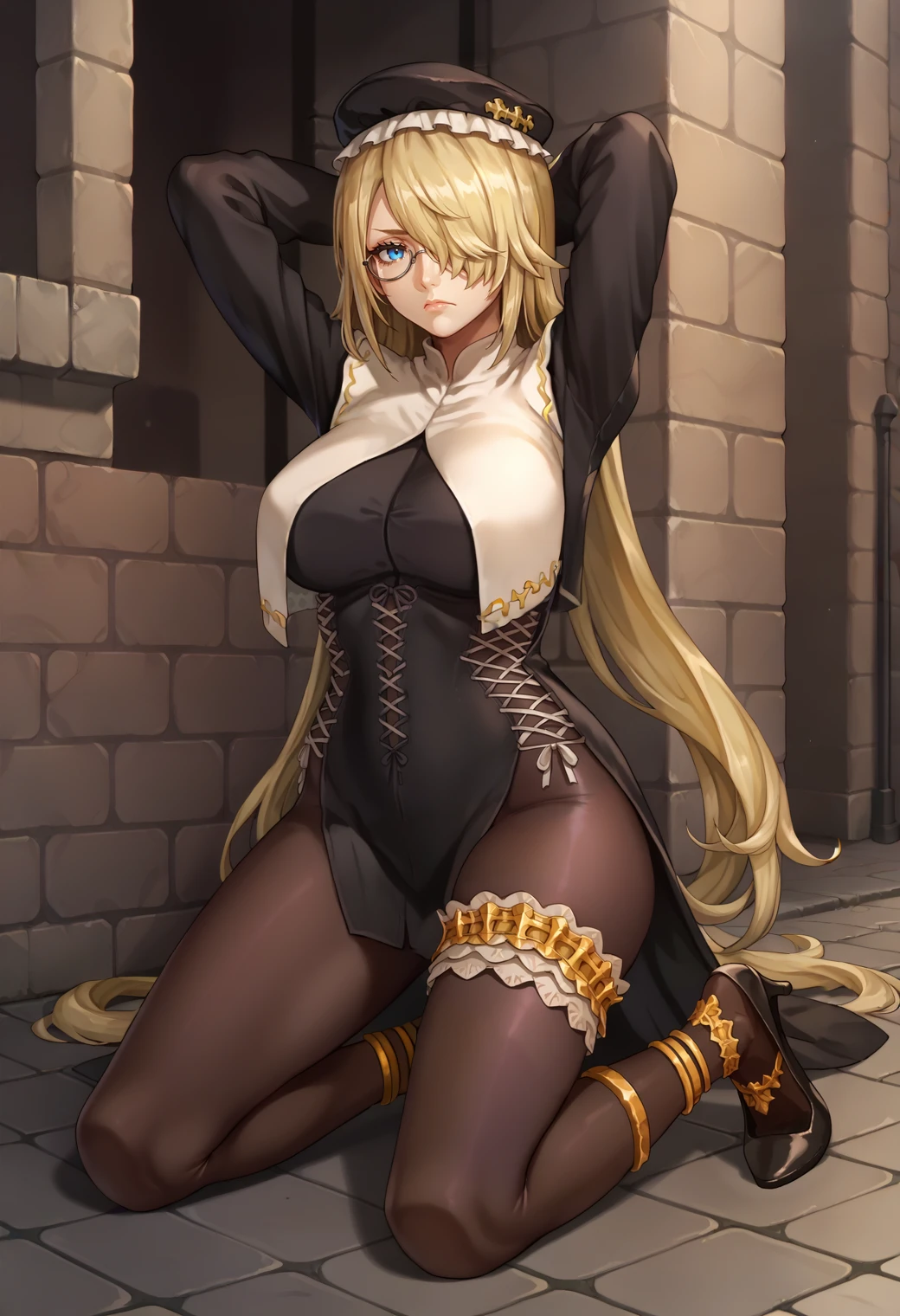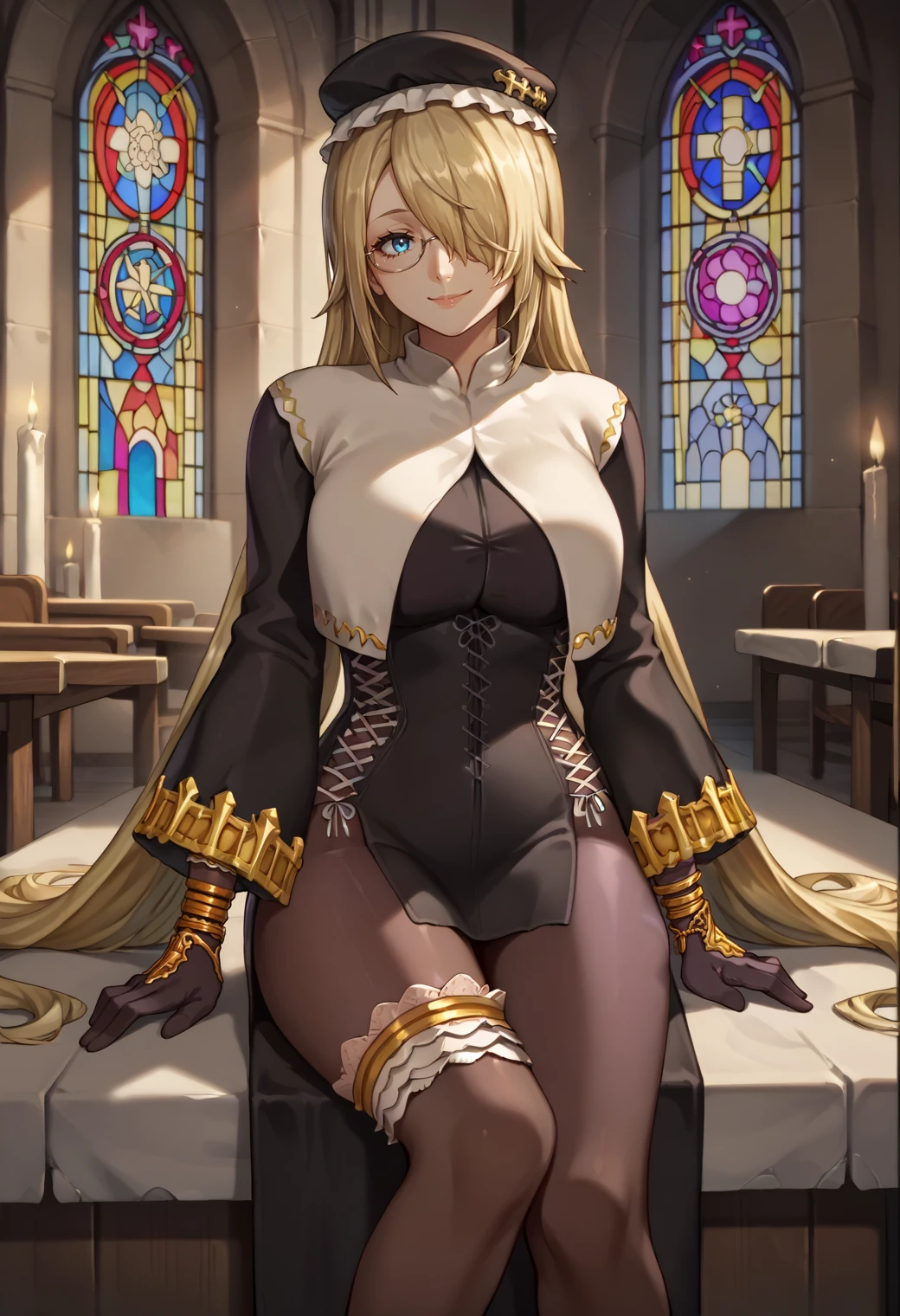 dmROTN, long hair, hat, hair over one eye, blue eyes, glasses, semi-rimless eyewear, black habit, large breasts, long sleeves, wide sleeves, purple elbow gloves, bracelet, purple pantyhose, bridal garter